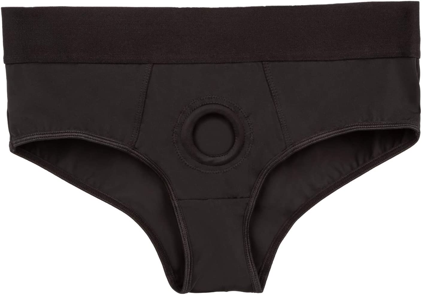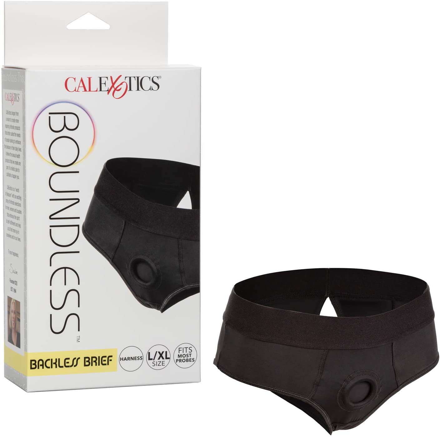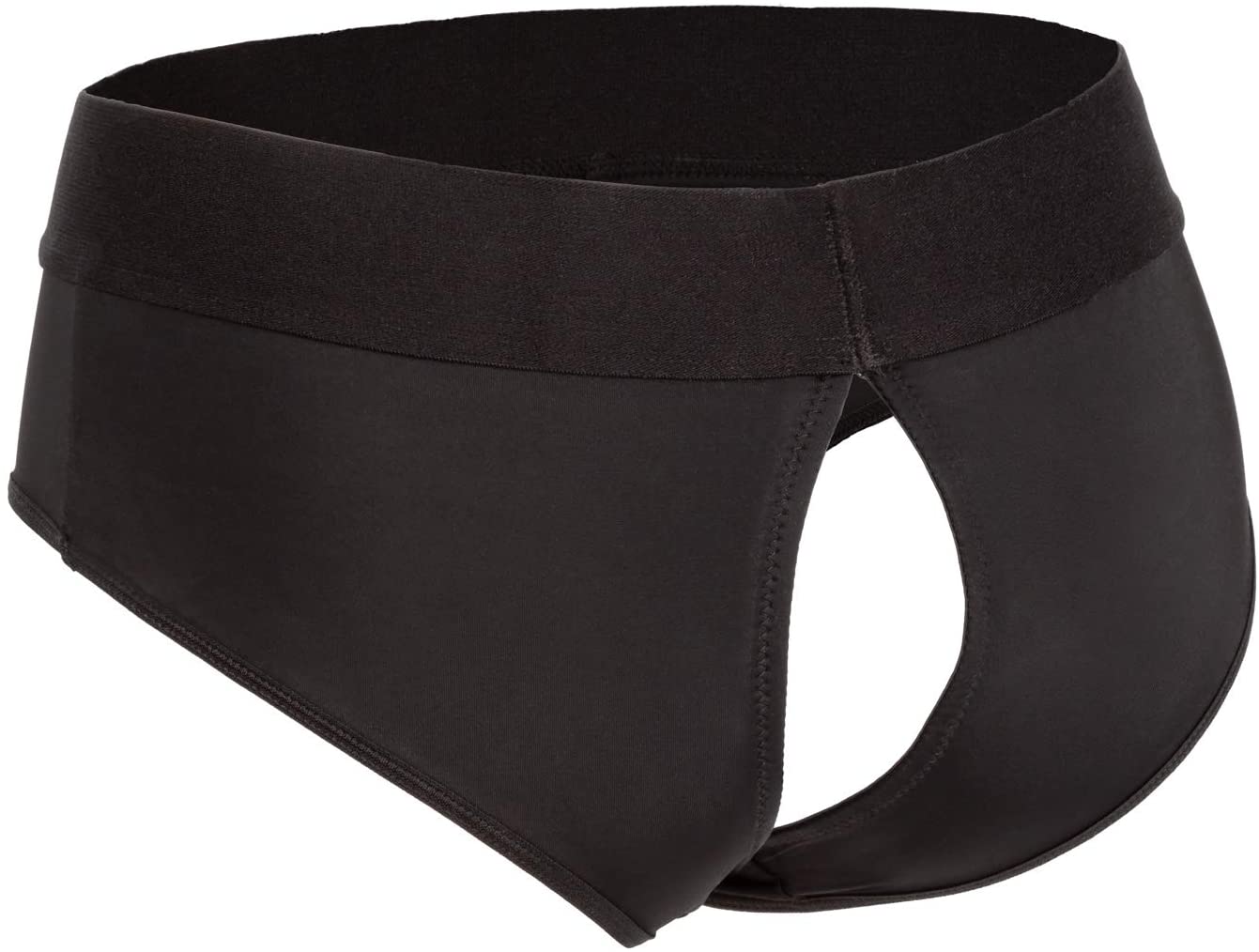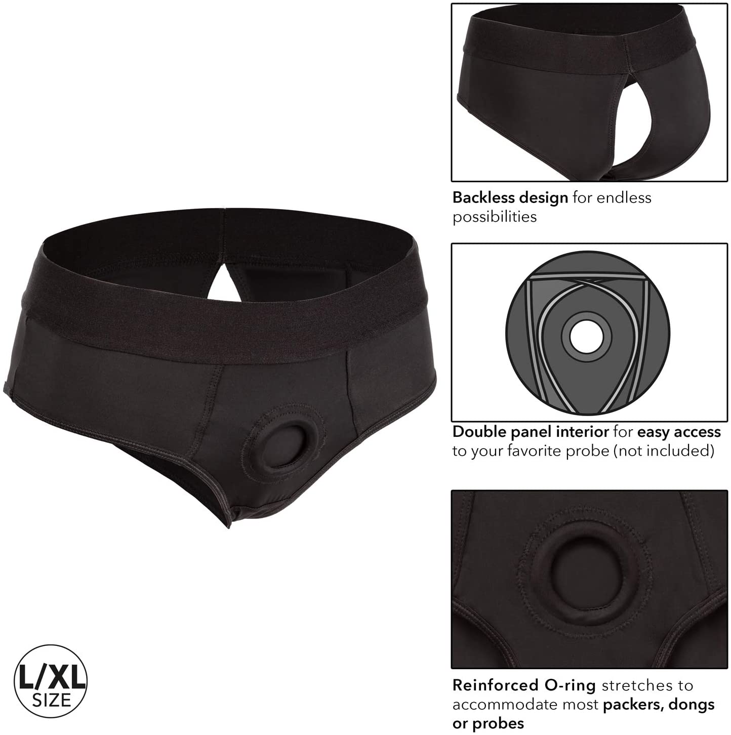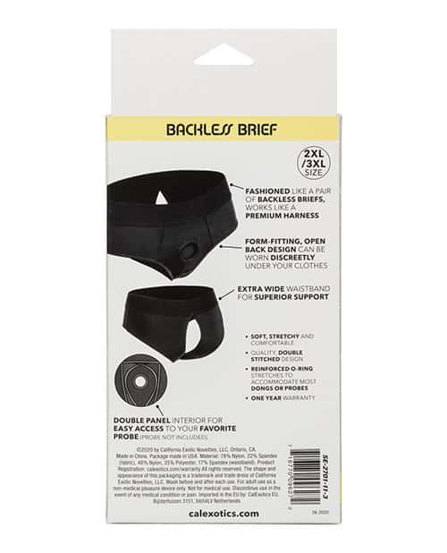 The CalexoticsBoundless™ Backless Brief is an ultra-comfortable harness fashioned like a risqué backless brief with powerful performance and comfort in mind. This bold harness has an extra-wide waistband, soft stretchy fabric and reinforced O-ring for the ultimate support. The durable, reinforced O-ring stretches to accommodate your favorite packer, vibrator or dildo.