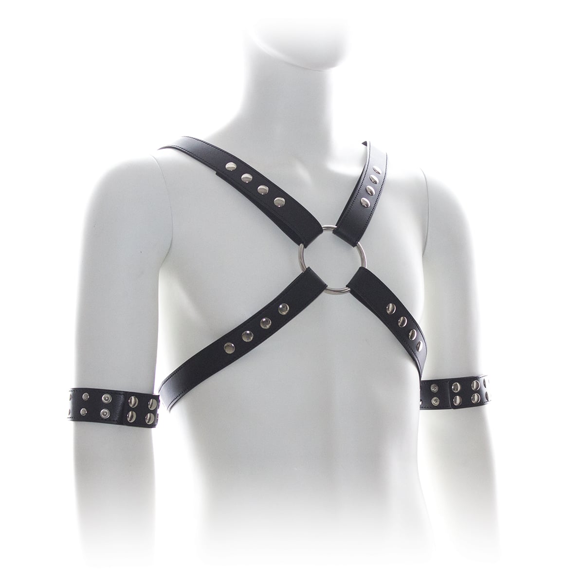 Naughty Toys bondage harness with arm restraints. This is a male bondage body leather harness with armbands set. Made of superior faux leather and nylon material, safe and comfortable. Fully Adjustable: each parts of the restraint kit are adjustable, suitable for you and your lover perfectly.