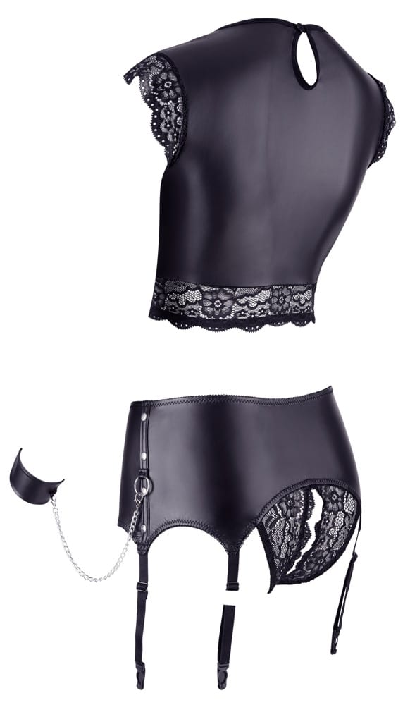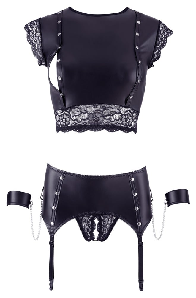 Κάνε κάθε φετιχιστικό σου όνειρο πραγματικότητα φορώντας αυτό το ποιοτικό, φετιχιστικό σετ εσωρούχων. Αποτελούμενο από στενή σε εφαρμογή, κοντή μπλούζα, στρινγκάκι με ανοιχτό κάβαλο και ζώνη καλτσοδέτα.