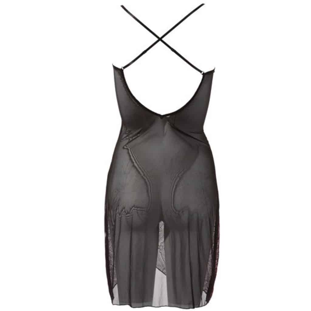 Bordeaux red netting dress by Cottelli with delicate black flock print and glitter decoration. It's a hot and sexy female outfit. The back of the dress is translucent black powernet. Adjustable straps, criss-crossed at the back, low cut front with a small rhinestone chain.