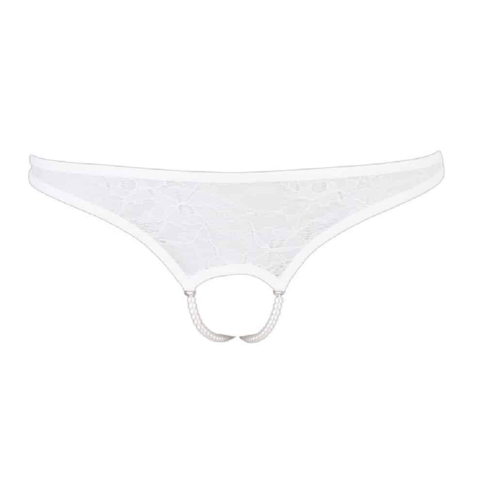 Crotchless white lace G-string with 2 rows of pearls which going all the way at the crotch area.