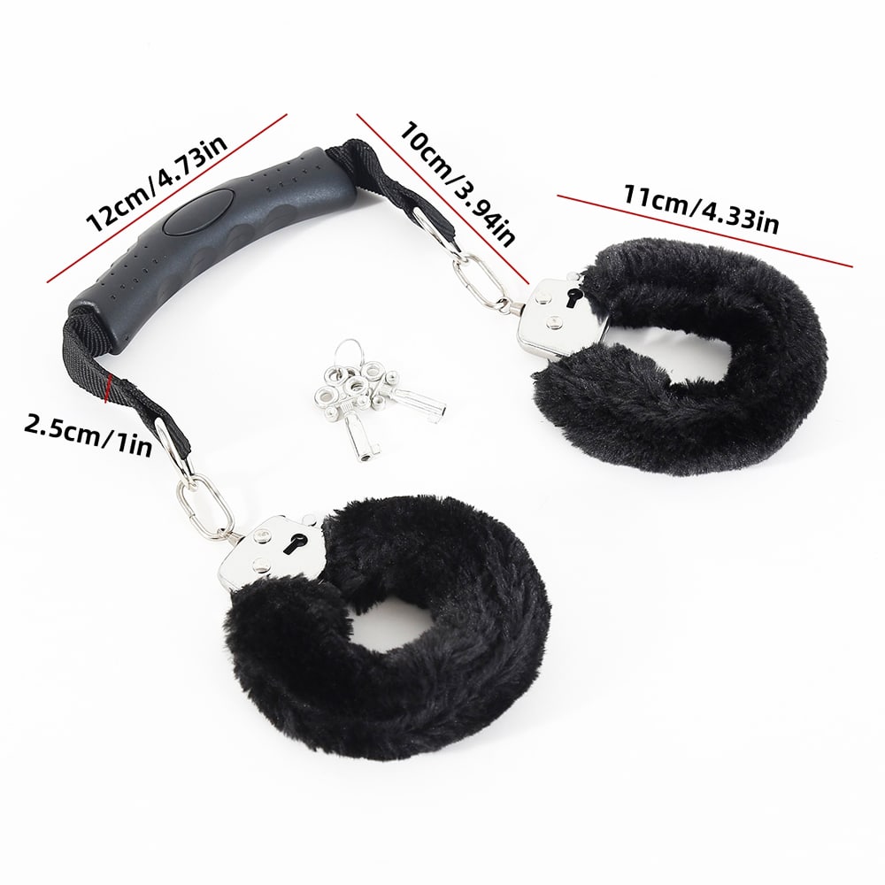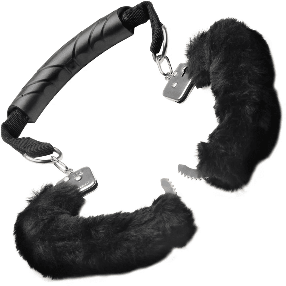 Black Handler Furry Handcuffs with Handle is a set of metal cuffs with connecting strap. Plush-Lined Metal Handcuffs with Connecting Strap – 63 CM (24.82'') Length, Black. A comfort-forward pair of plush-lined metal handcuffs linked by a sturdy strap. The soft faux-fur lining reduces pressure at contact points while the strap provides easy positioning and display appeal. Non-electric and simple to maintain—an approachable restraint option for beginners. Read and learn more at the product's main page below or visit one of our physical stores in Limassol and ask for product presentation.