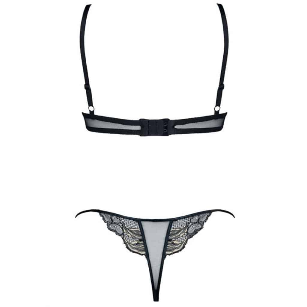 The bra beautifully highlights the breast shape. Made out of transparent net and the upper part is decorated with a black and gold lace.