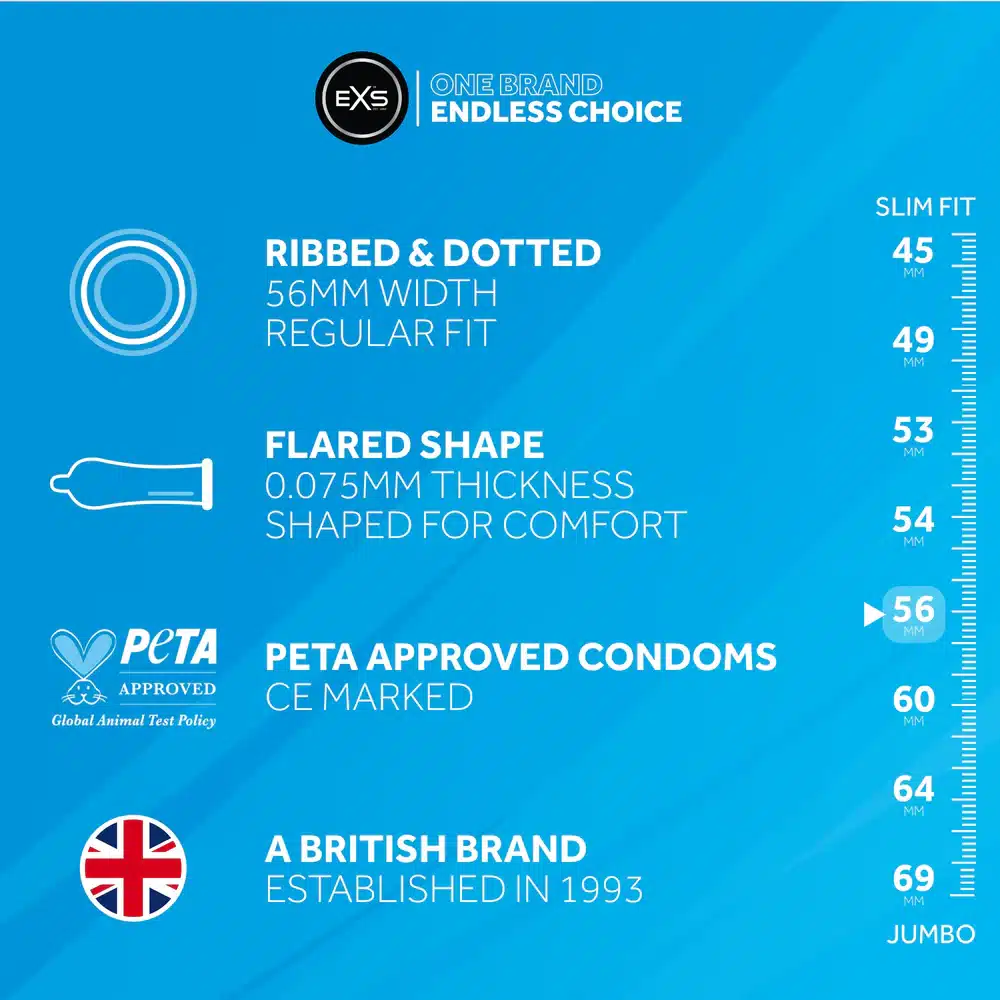 Τα προφυλακτικά EXS Ribbed Dotted & Flared είναι σχεδιασμένα με ραβδώσεις, κουκκίδες και με φαρδύ άκρο για μέγιστη ευχαρίστηση για εσάς και τον/την σύντροφό σας. Αυτά τα προφυλακτικά με υφή είναι κατασκευασμένα από κρυστάλλινο και άοσμο λατεξ. Τα προφυλακτικά EXS προέρχονται από το Ηνωμένο Βασίλειο και είναι κατασκευασμένα από 100% φυσικό ανώτερης ποιότητας λατέξ, διασφαλίζοντας αξιοπιστία και μέγιστη άνεση. Πληρούν ή ξεπερνούν τις διεθνείς προδιαγραφές. ΣΕ ΣΥΣΚΕΥΑΣΙΑ ΤΩΝ 3 ΠΡΟΦΥΛΑΚΤΙΚΩΝ.