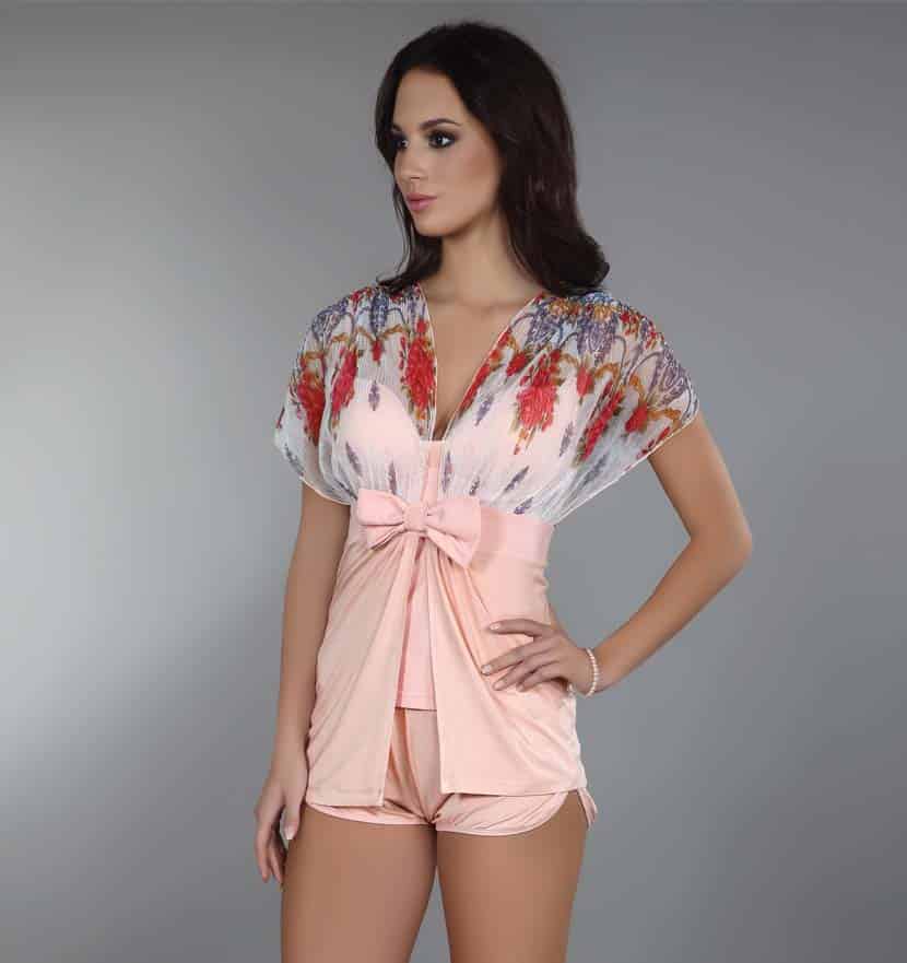Comfortable kimono in peach color and flower printed upper part.