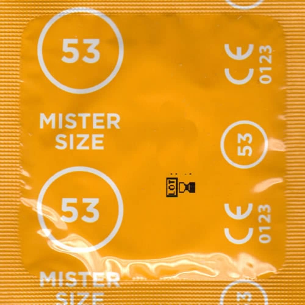 Transparent, extremely thin Mister Size condoms (53 mm) made out of natural rubber latex. The condoms are covered in lubricant and are teat-ended. Vegan. A man/woman can pick the right condom size for the penis by using the front of the packaging because there is a wide, dark blue measuring scale in the middle. Size 53 is suitable for a penis circumference of 10.5 to 12 cm.