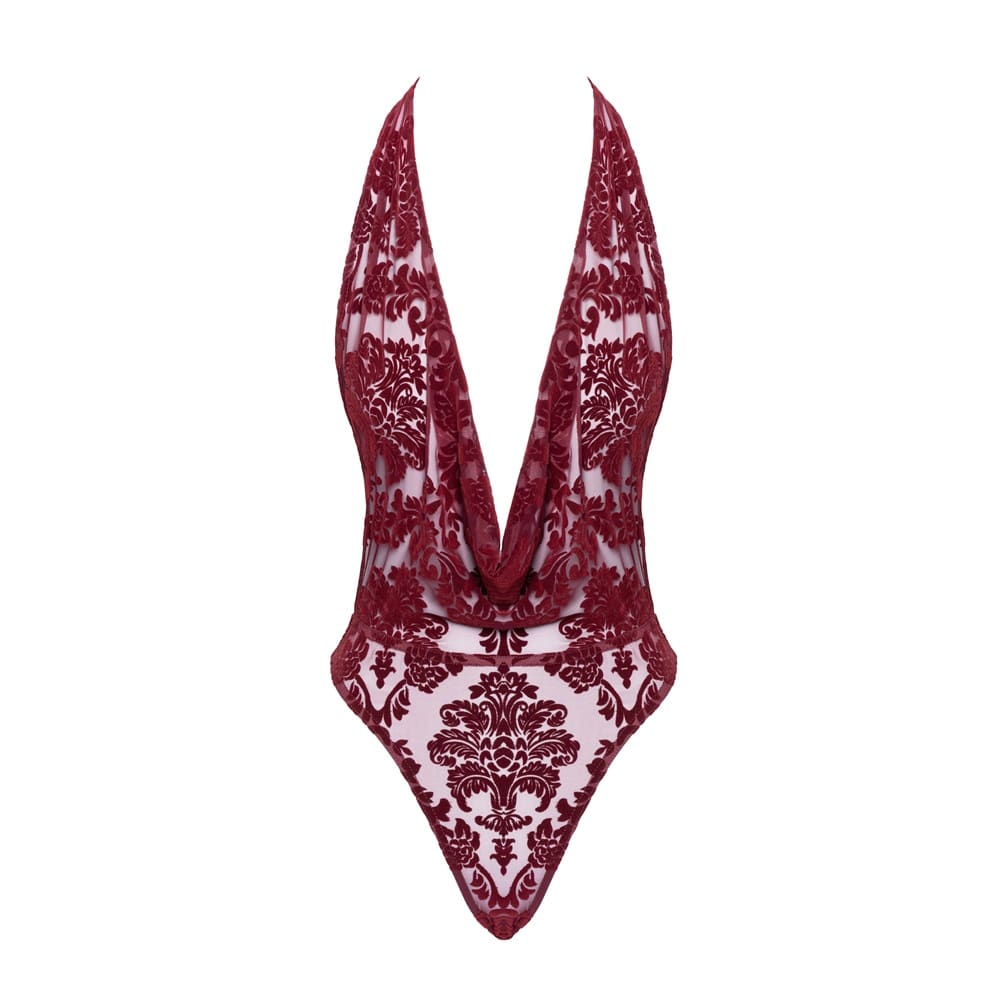 This sensual burgundy flocked bodysuit is the ultimate statement piece for daring elegance. Crafted from a soft, velvety flocked fabric, it feels luxurious against the skin while comfortably contouring your figure for a second-skin fit. Wear it on its own for a head-turning look or easily layer it for versatile style. The design showcases beautiful feminine lines with an elegant cowl neckline and a striking open back. The thong cut ensures a sleek, elongated silhouette. Embrace subtle seduction and confident style with this piece that perfectly blends sophistication and daring fashion. FOR MORE PRODUCT INFORMATION, please, visit the main product's page down below or visit one of our physical stores in Limassol and ask our staff for product presentation…