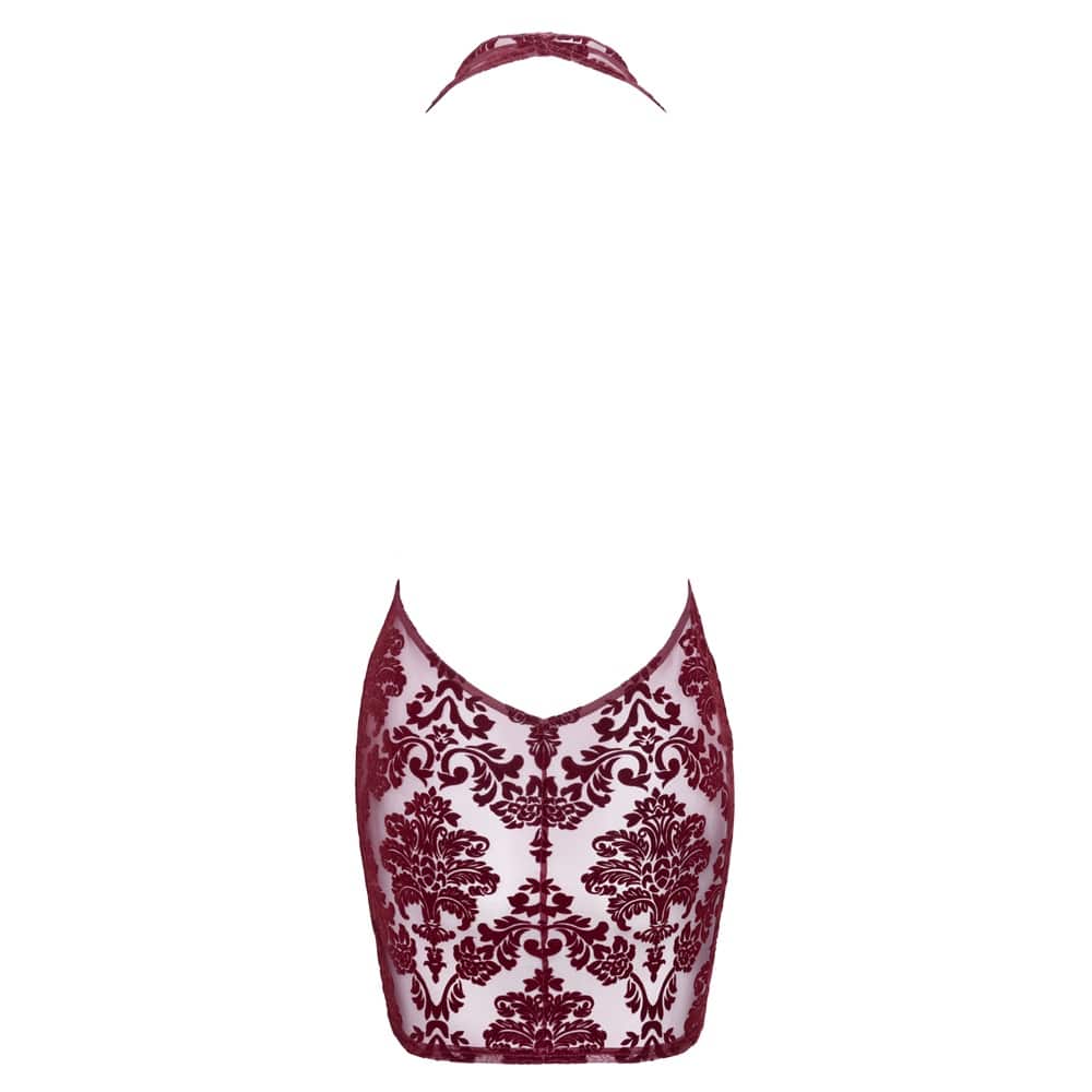 Statement-making short dress in luxurious burgundy flocked tulle. Features a sensual open back and cowl neck for captivating, unforgettable evenings. FOR MORE PRODUCT INFORMATION, please, visit the main product's page down below or visit one of our physical stores in Limassol and ask our staff for product presentation…
