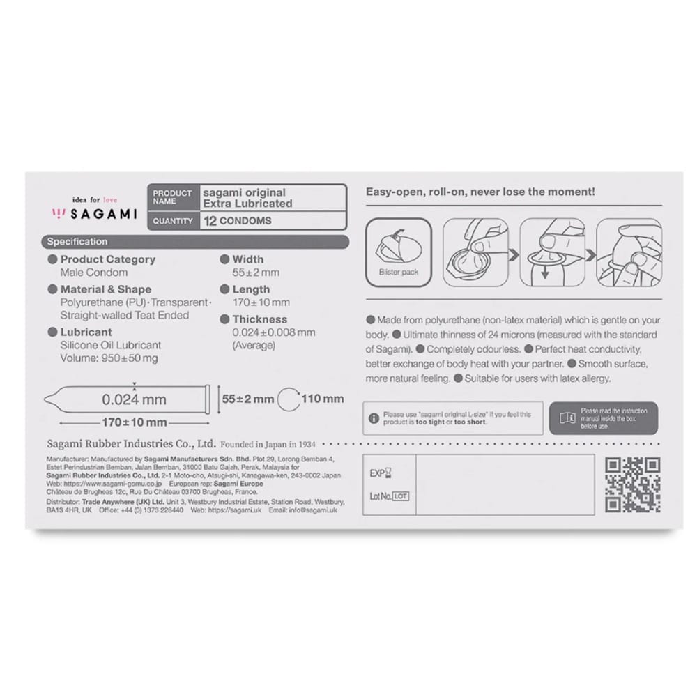 Δώστε νέα ένταση στην ερωτική σας ζωή με το Sagami Original 0.02 με έξτρα λίπανση! Με πολυουρεθάνη πάχους μόλις 0,02 χιλιοστών αλλά έως και 5 φορές πιο ανθεκτική από το λάτεξ προσφέρει φυσική αίσθηση, άνεση και άμεση μετάδοση θερμότητας για μεγαλύτερη οικειότητα. Είναι άοσμο, υποαλλεργικό, ιδανικό για όσους έχουν ευαισθησία στο λάτεξ και διαθέτει λεία, μεταξένια υφή και έξτρα λίπανση για ακόμα πιο ομαλή εμπειρία. Το πιο δημοφιλές προφυλακτικό πολυουρεθάνης στην Ιαπωνία, σχεδιασμένο για όσους θέλουν ασφάλεια, αντοχή και φυσικότητα μαζί. ΓΙΑ ΠΕΡΙΣΣΟΤΕΡΕΣ ΠΛΗΡΟΦΟΡΙΕΣ ΓΙΑ ΤΟ ΠΡΟΪΟΝ, επισκεφθείτε την κύρια σελίδα του προϊόντος πιο κάτω ή επισκεφθείτε ένα από τα φυσικά μας καταστήματα στη Λεμεσό και ζητήστε από το προσωπικό μας παρουσίαση του προϊόντος…