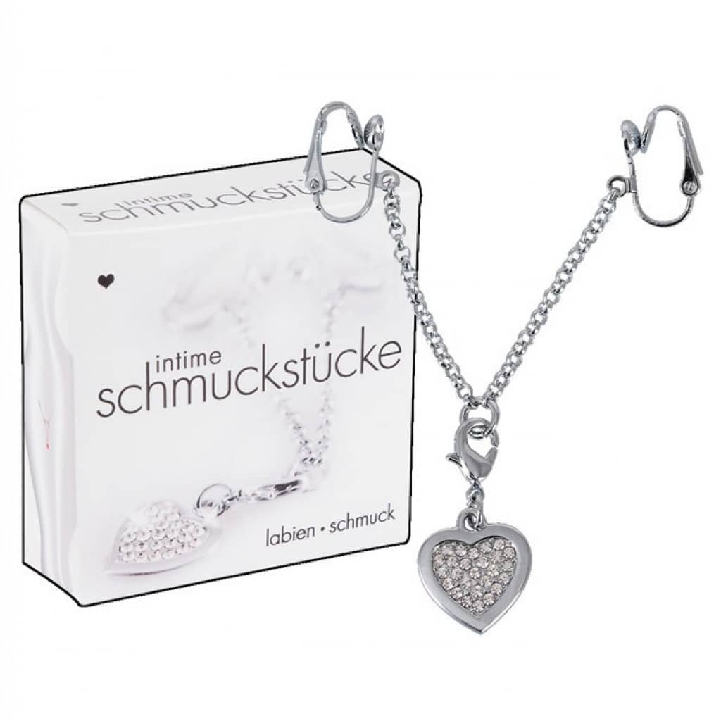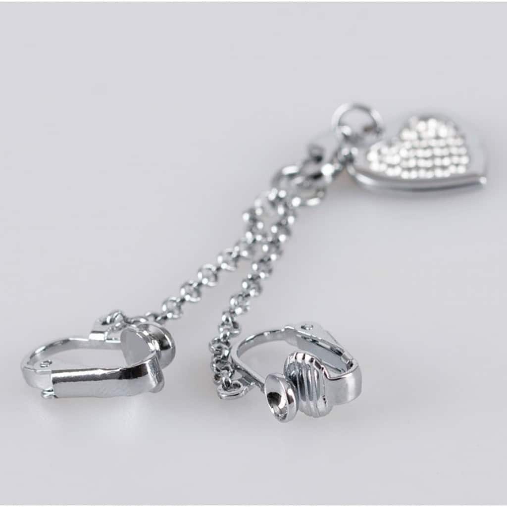 Silver-coloured chain with labia clips and a heart-shaped medal (1.5 cm) with decorative rhinestones.