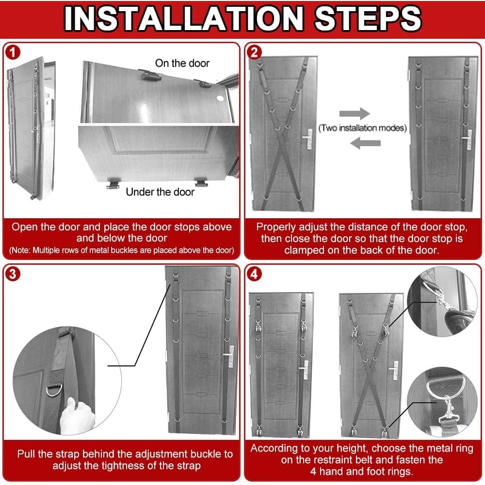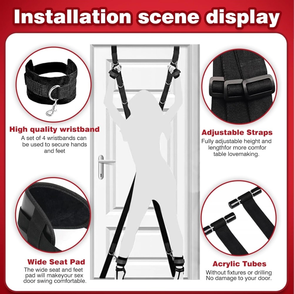 Black adjustable bondage play cross door straps restraint set with hand and ankle Cuffs. Elevate your intimate moments with the Over The Door Restraint – a versatile and comfortable accessory designed to bring an exciting edge to your private adventures. Crafted with premium materials, including faux fur, neoprene, and durable nylon, this restraint system is both soft on the skin and sturdy enough to ensure a secure fit. Its adjustable design fits seamlessly over most doors, allowing you to transform any room into your personal play space. Easy to set up and even easier to use, this restraint is perfect for enhancing trust, intimacy, and playful exploration.