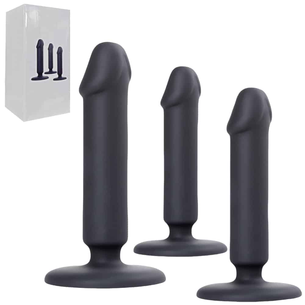 TOYBOY Black Trio silicone dildo Set with silicone dildos in different size options. Small, medium and large. Read more detailed dimension report, in product's main description page down below. No balls and act as butt plug dongs. Made with body-safe medical grade silicone. Soft touch and bendable. Each dildo plug curries a strong suction base cup for hands and mind free play. Ideal for anal or vaginal penetration-stimulation. Dildos are strap-on compatible too. Read and learn more at the product's main page below or visit one of our physical stores in Limassol and ask for product presentation..