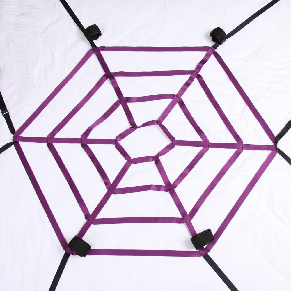 Purple Spider Web Bed Restraints Strap Set – Purple and Black Bondage Kit with detachable Handcuffs and Ankle Cuffs. Turn almost any bed into an instant bondage playground with the incredible Bondage Web! This easy-to-install versatile bed restraint system is all you need to enjoy a night of fetish and fun in your own bedroom, using the bed you already own! The kit includes an adjustable nylon web, which easily adjusts to fit over most size mattress–full, queen size–along with four adjustable neoprene wrist and ankle cuffs. When used together, the cuffs attach to the web with small velcro loops and slide along the webbing, keeping your lover bound to the web with no way to escape.