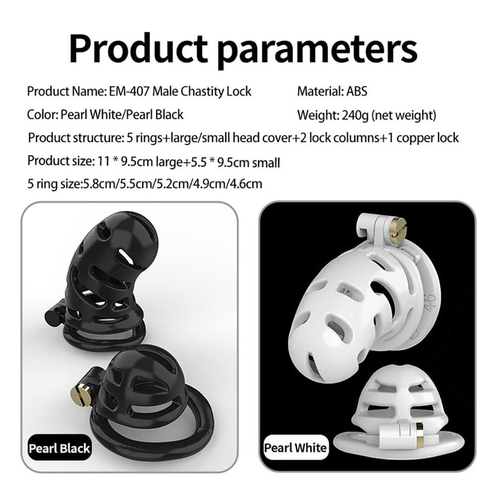 Set of 2 Different Sizes of Chastity Cages: Chastity cage set includes 2 different sizes of penis cages with length of 1.73in/3.35in (43mm/85mm) and inner diameter of 1.80in/1.93in (45mm/49mm). Each set of chastity cage contains 5 different ring sizes: 1.73in/1.93in/2.05in/2.17in/2.28in (46mm/49mm/52mm/55mm/58mm) , you can match the right cage and ring to your penis size.