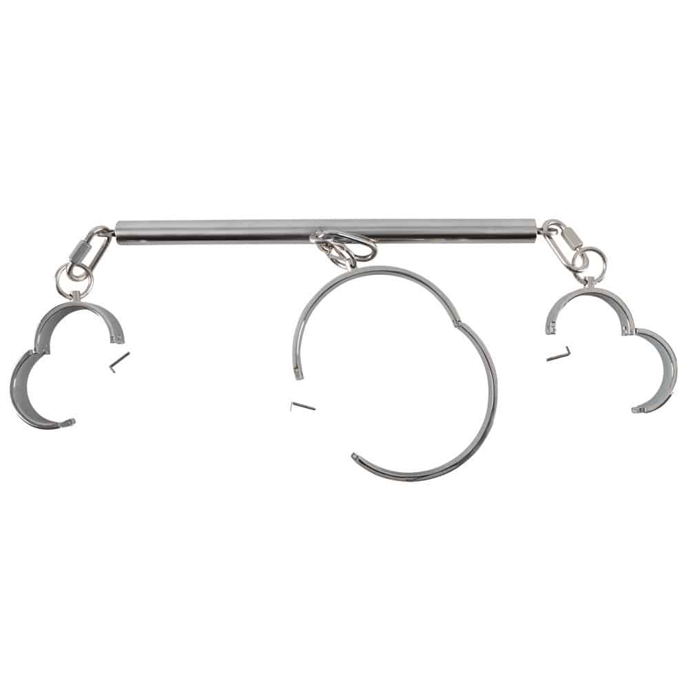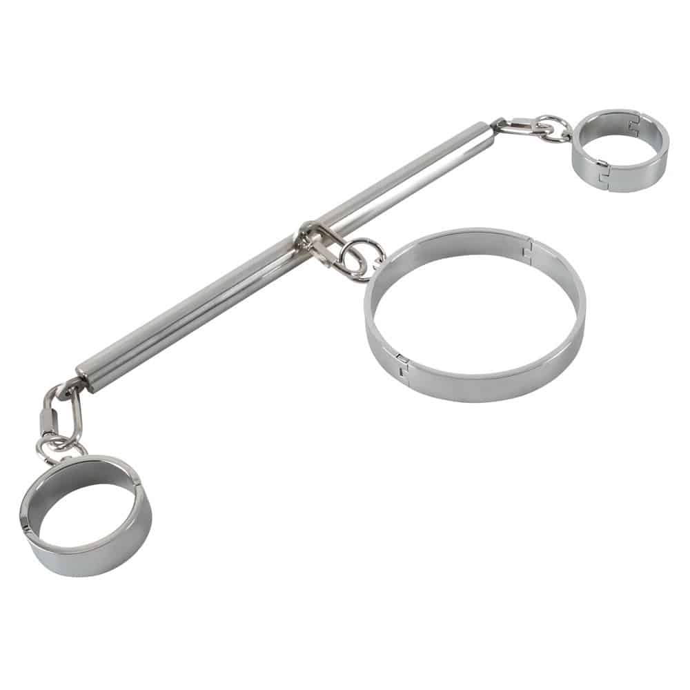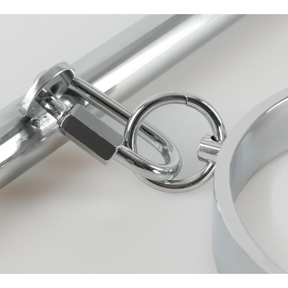 Professional bondage set with a collar, handcuffs and pillory. A high-quality finish, made out of shiny stainless steel. With practical magnetic fasteners that include pins. All the snap hooks can be unscrewed.