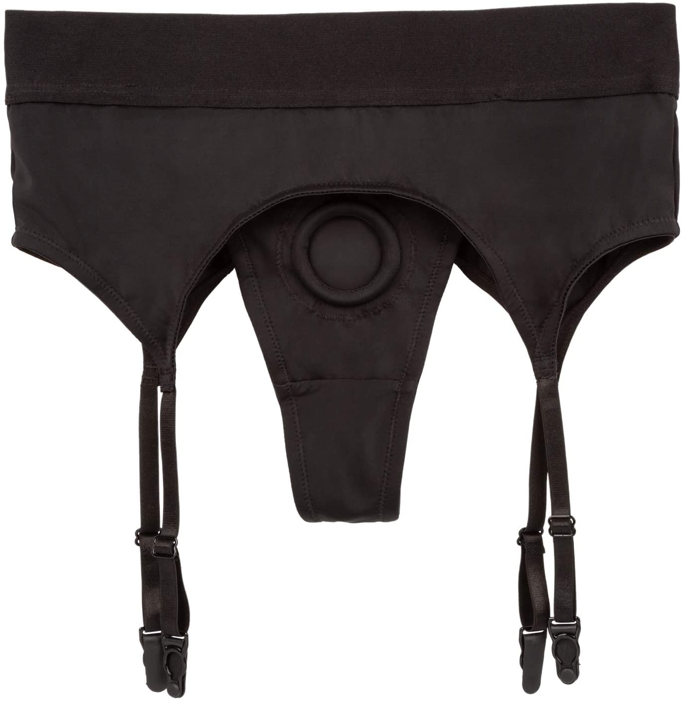 The CalExotics Boundless™ Thong with Garter is an ultra-comfortable harness fashioned like a risqué backless brief with powerful performance and comfort in mind. This bold harness has an extra-wide waistband, unique garter belt design and reinforced O ring for the ultimate support. The durable, reinforced O-ring stretches to accommodate your favorite packer, vibrator or dildo. With a form-fitting design, this comfort harness can be worn discreetly under clothes. The sensual garter belt is complete with adjustable straps for a sexy, yet comfortable fit. Enjoy pleasure made for two with the double panel interior for easy access to your favorite probe.Beginners and expert users alike will love frustration-free pleasure with this easy-to-wear harness.