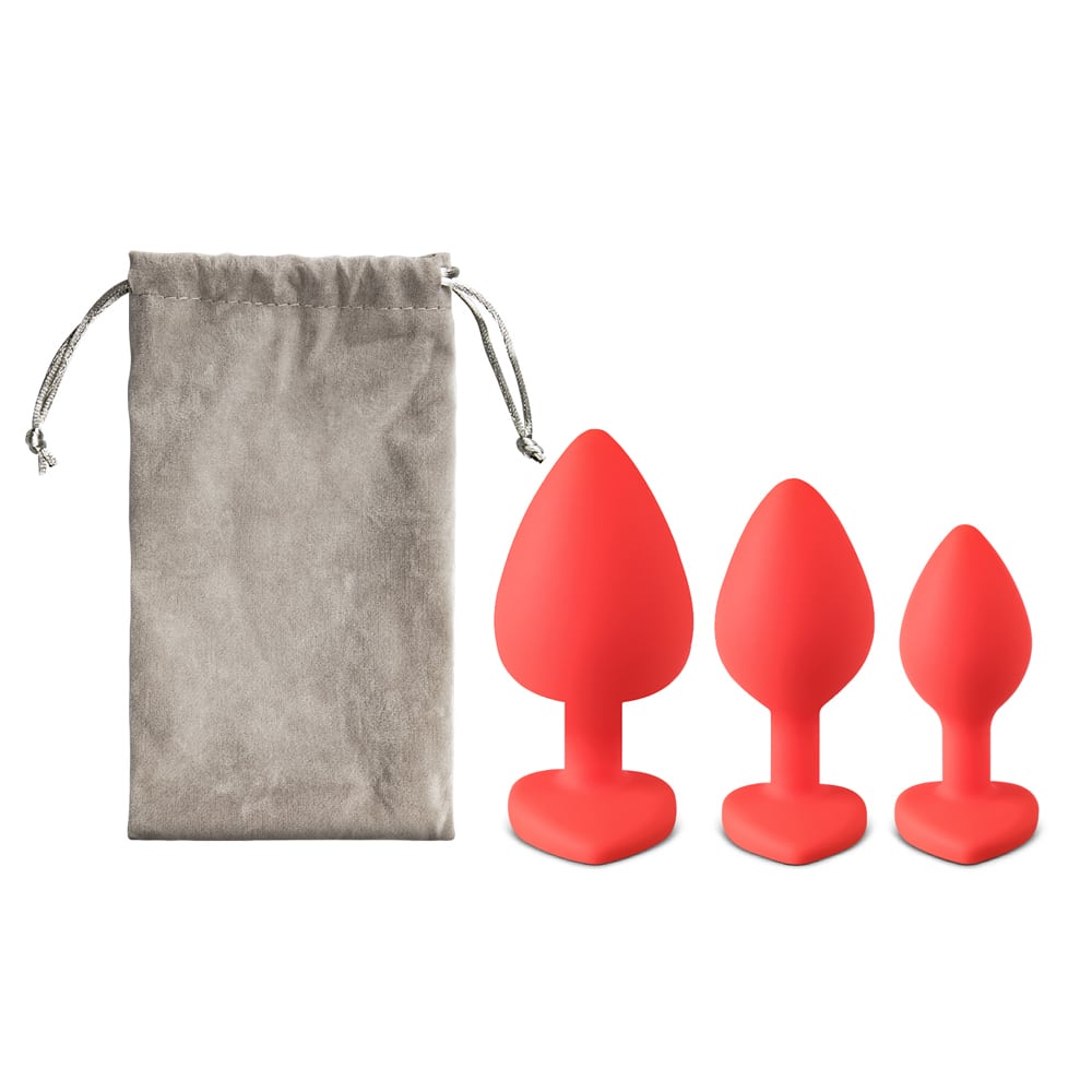 Red Color Silicone Butt Plug Set with three different size options. Small, medium and Large. Give your booty the love it deserves with this jeweled heart-shaped silicone butt plug set, featuring plugs gradually increasing in size for the safe orgasmic enjoyment and stretching. An eye-catching red with red color, not to mention some bling for the bum; this butt plug set is perfect for anyone who requires just a little extra anal penetration. At the base is a faux red jewel, great for those occasions when the wearer wants to parade around the room showing off their new accessory (if at a ‘party’, it might work a treat with an open-bum outfit). For maximum pleasure always use with lubricant and don’t forget to clean up afterwards with Pulse & Cocktails’ specially formulated toy cleaner. We advise you to only use water based lubricant with this toy. Read and learn more at the product's main page below or visit one of our physical stores in Limassol and ask for product presentation..