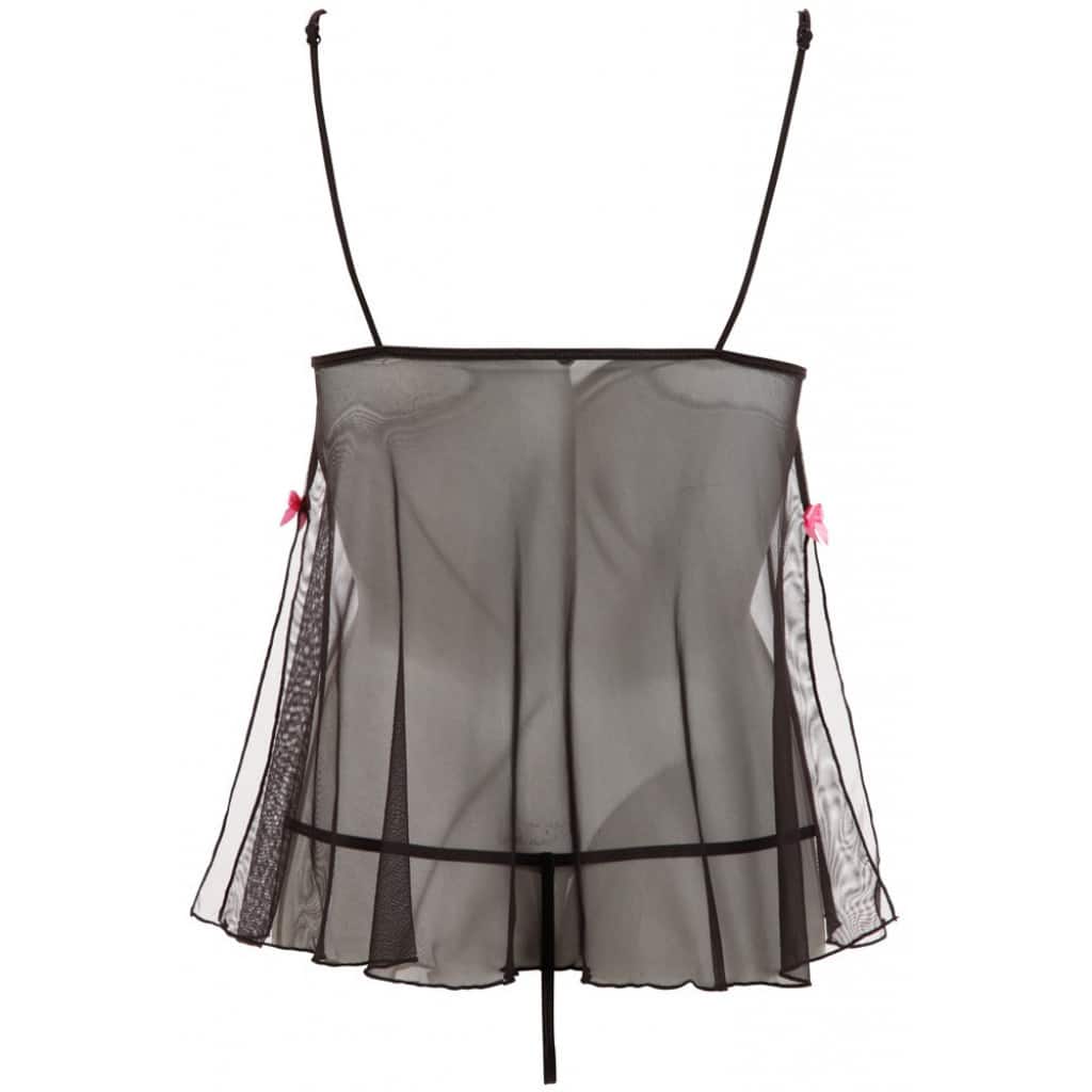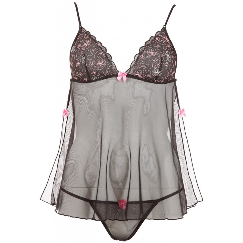 Translucent powernet babydoll with sophisticated lace details and green/rose embroidery on the cups.