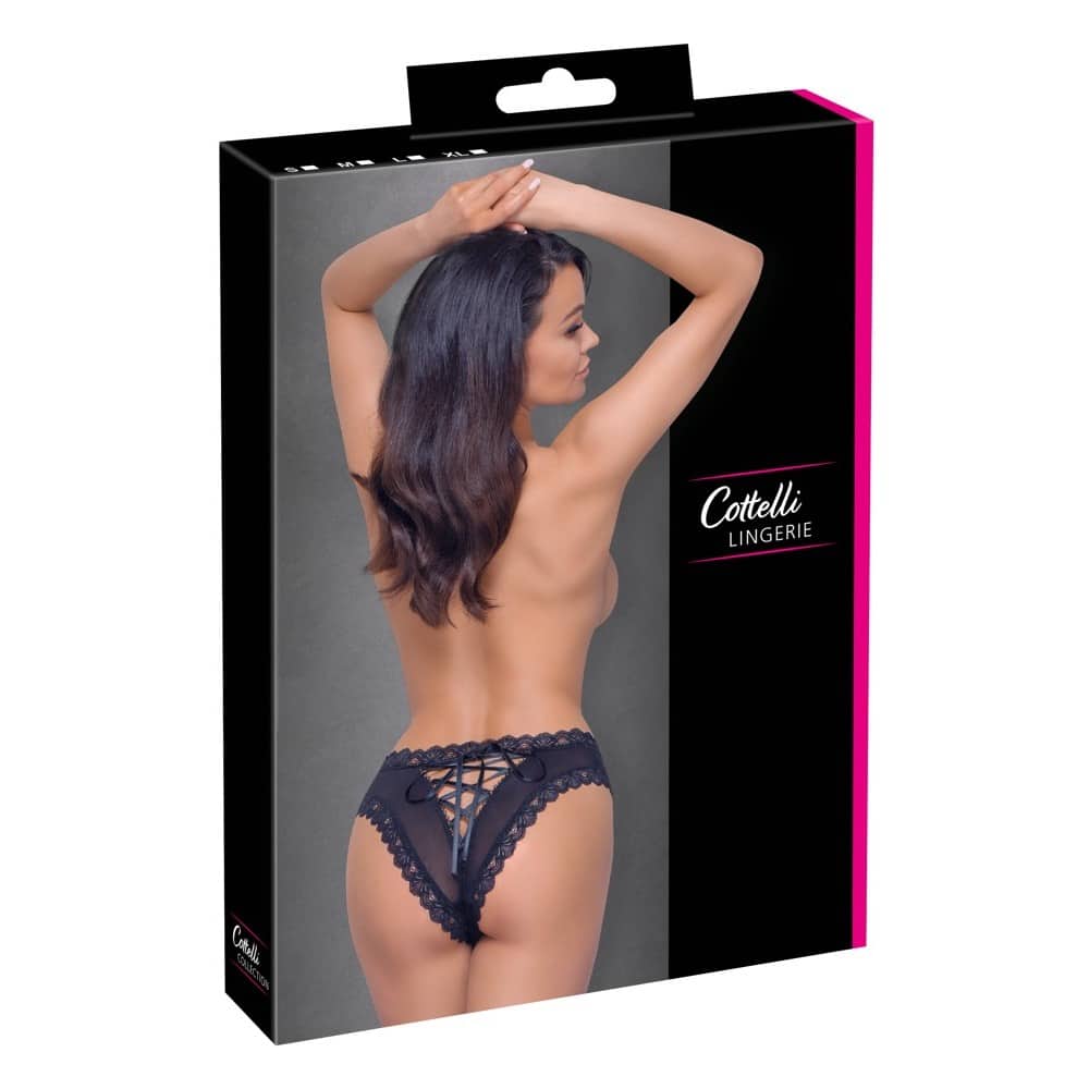 Beautiful briefs with a fancy backside! Black briefs from Cottelli LINGERIE made out of powernet with delicate lace on the waistband and around the legs. The satin ribbon lacing over the buttocks is very fancy. The soft and stretchy briefs fit wonderfully and are extremely comfortable to wear.