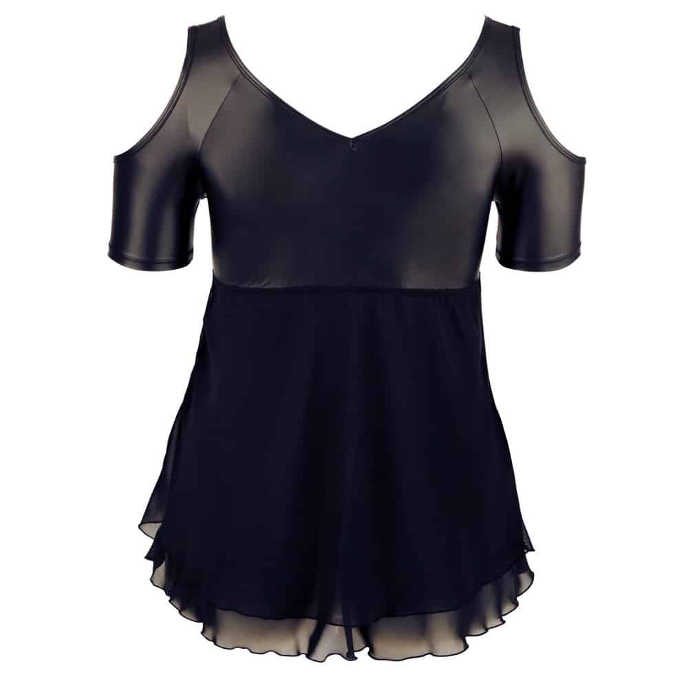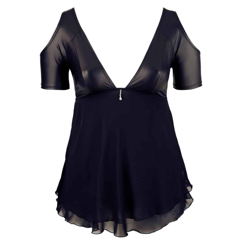 Hides unwanted padding and emphasises feminine curves! The low-cut, cold shoulder babydoll has rhinestone decoration at the front and short sleeves. The top part is made out of matte material and the bottom part is made out of flared, double-layered chiffon.