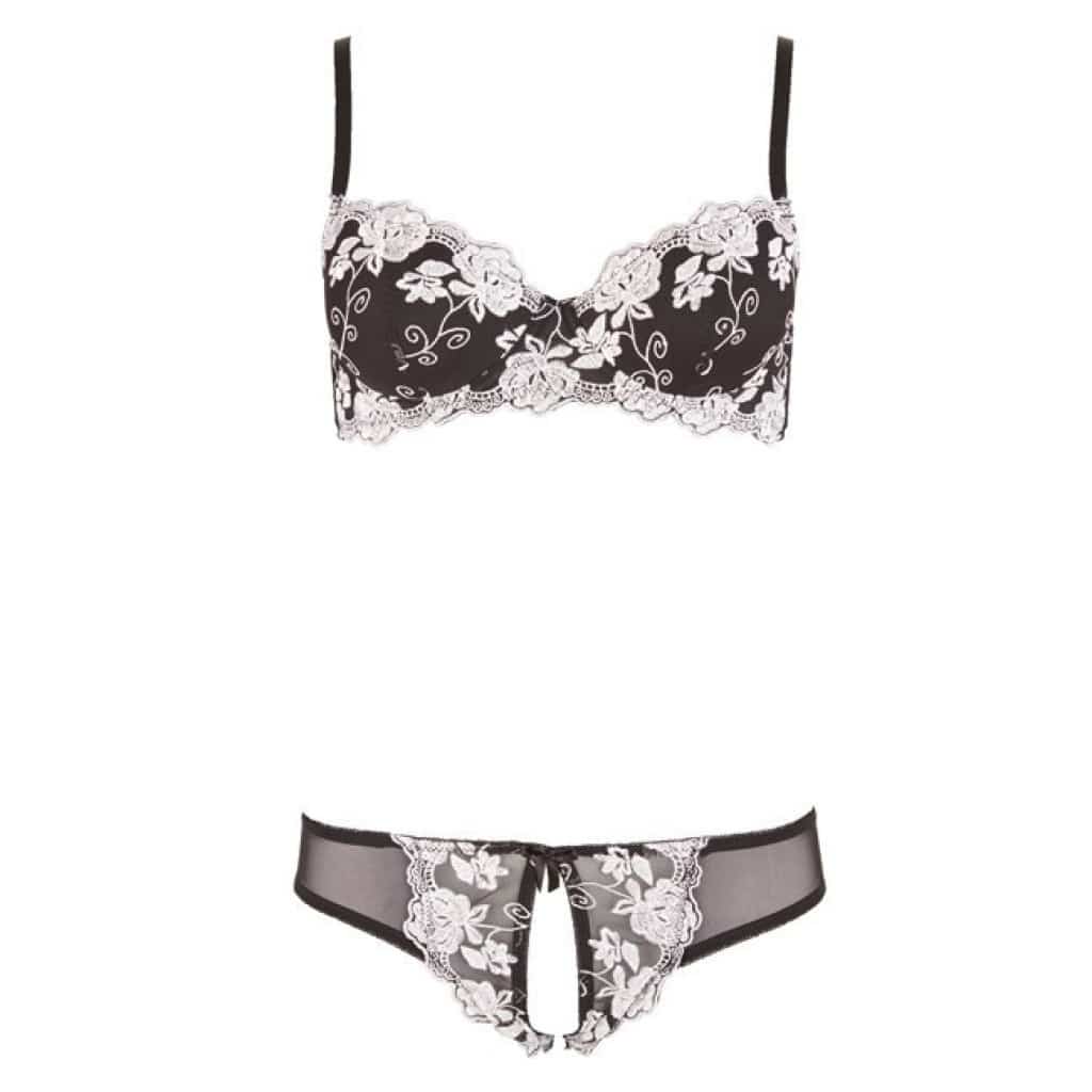 Black embroidered underwired bra with slightly padded cups and briefs that are completely open in the crotch area.
