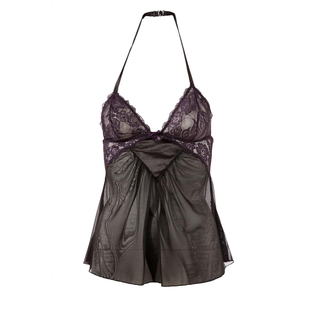 Seductive slightly translucent flared babydoll with purple lace cups and halterneck that ties and can be adjusted for the better fitting. The lingerie let the back almost completely naked.