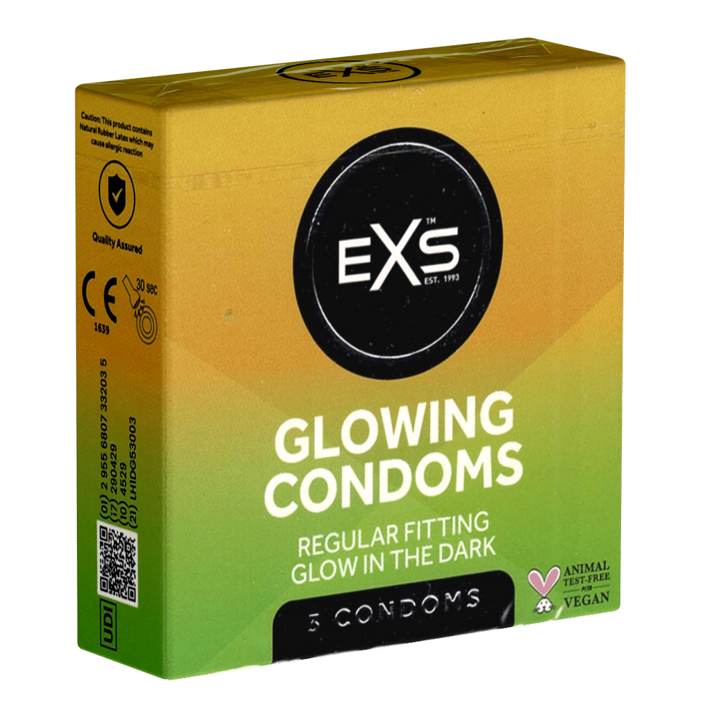 Glow-in-the-dark condoms are absolutely in. Simply hold them up to the light for half a minute (or place them under the bedside lamp) and then the fun can begin. Just turn off the lights and let the passion glow with EXS Glow-in-the-Dark Condoms. Designed to add an element of fun and excitement to your intimate encounters, these condoms not only offer reliable protection against unwanted pregnancies and sexually transmitted infections, including HIV but also illuminate in the dark for a captivating experience.