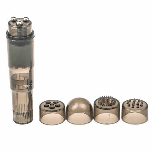 First time vibrator for single ladies and or begginer couples. Dark grey to black single speed and powerful pocket vibrator with four seperate head attachments. This Black Powerful Pocket Vibrator is the perfect clitoral stimulation toy.