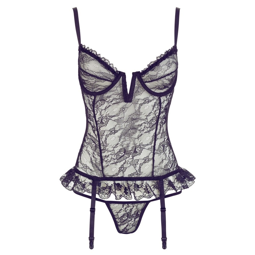 Basque made out of lace with underwired cups, a low-cut cleavage area in a V shape and ruffled lace on the hem. Hook fastener at the back. The straps and 4 suspender straps are adjustable. Includes a matching string. Black. 90% polyamide, 10% elastane. Without stockings.