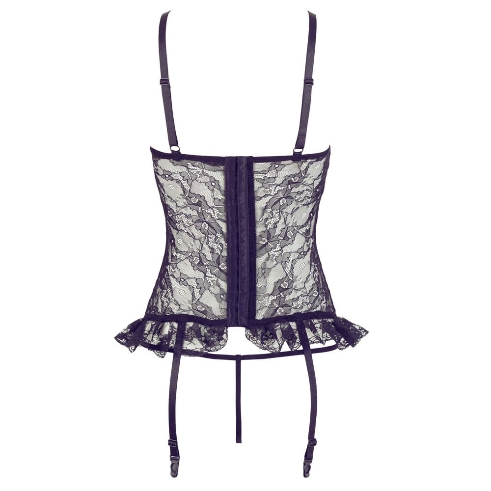 Basque made out of lace with underwired cups, a low-cut cleavage area in a V shape and ruffled lace on the hem.