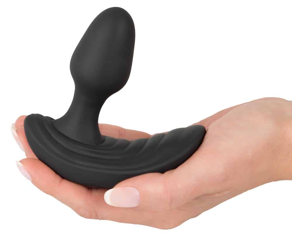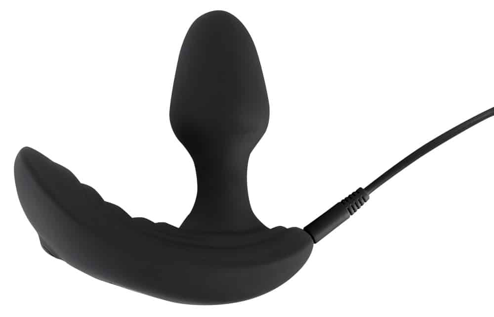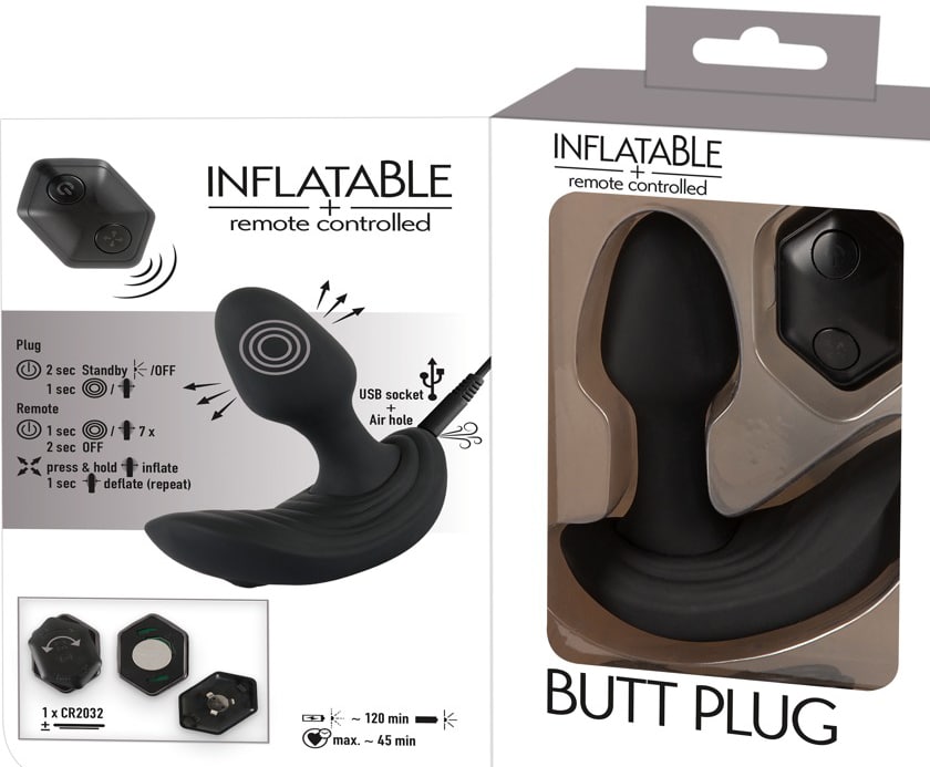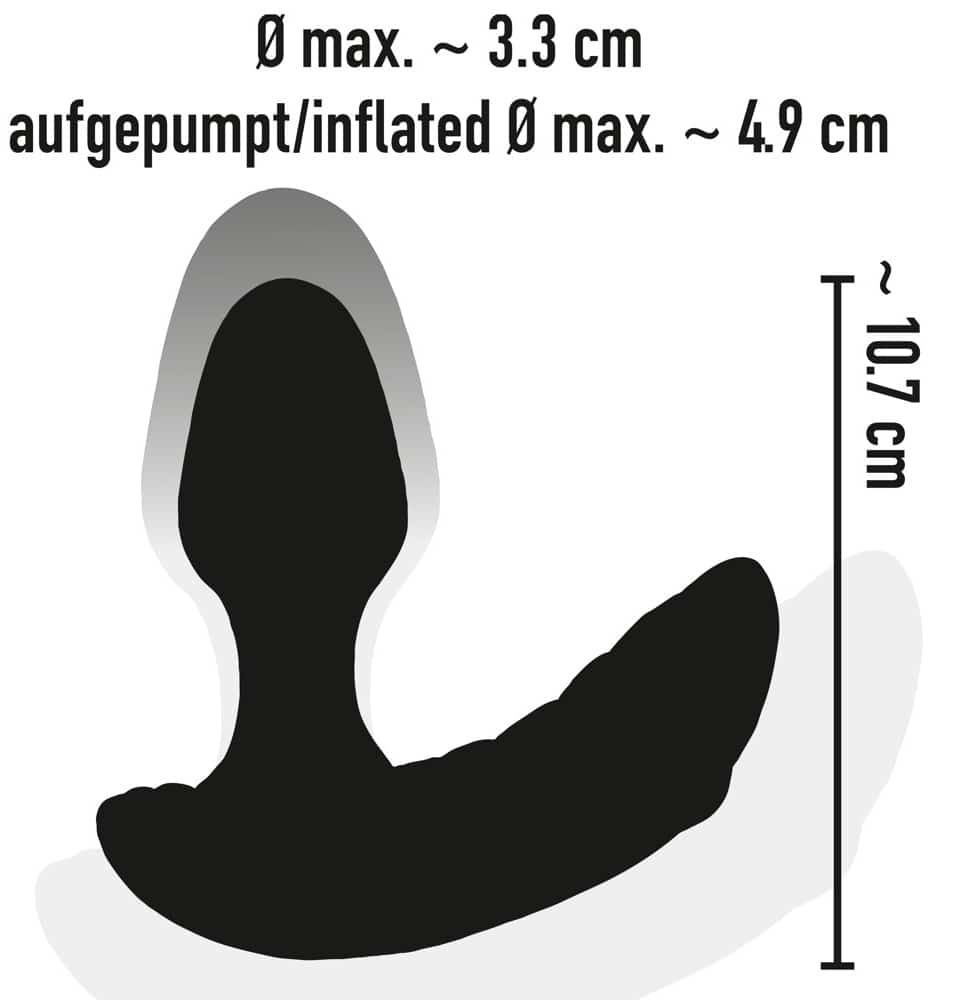 Wonderfully shaped, flexible anal vibrator Butt Plug from Inflatable + RC with pronounced texture on the perineum bar for simultaneous stimulation of the prostate and perineum. It can also be inflated so that it is large and bulging – for a wonderful full feeling. It is also suitable for anal stretching too. Vibration (7 modes), pump function and air release function can be controlled separately at the push of a button on the remote control. When the vibrations are turned on, the anal vibrator pumps automatically in various pulsating rhythms for a very realistic feeling. The user just has to press the button on the remote control again it they want to reduce the size of the anal vibrator. The fancy plug is covered in soft silicone which feels great against the skin and when it s being worn. It can be recharged with the included USB cable. Includes batteries (CR2032) for the remote control.