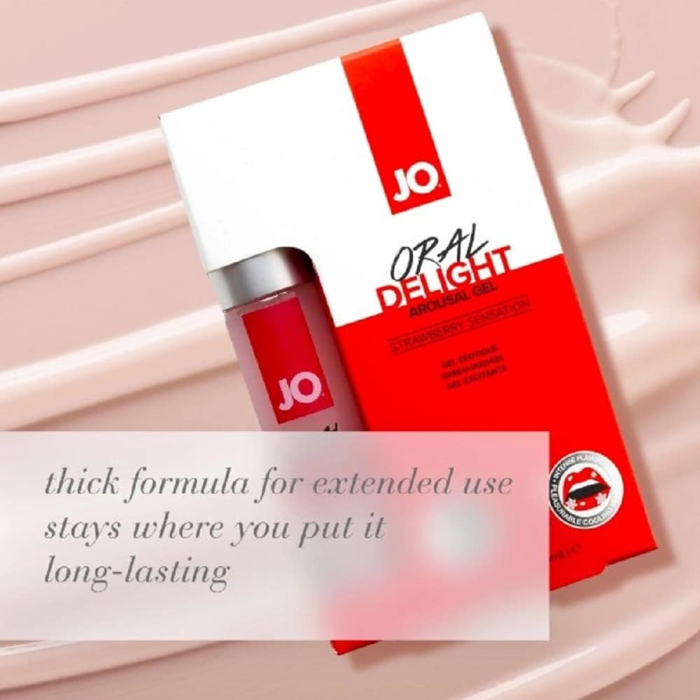 Jo Oral Delight Strawberry 30ml. Take your intimacy to an entirely new level with this delicious strawberry flavor and tingle sensation. The joy of giving and receiving! Add a playful twist to giving and receiving with Oral Delight. This gel offers a cooling sensation to enhance oral pleasure and delivers delicious lip-smacking flavors.