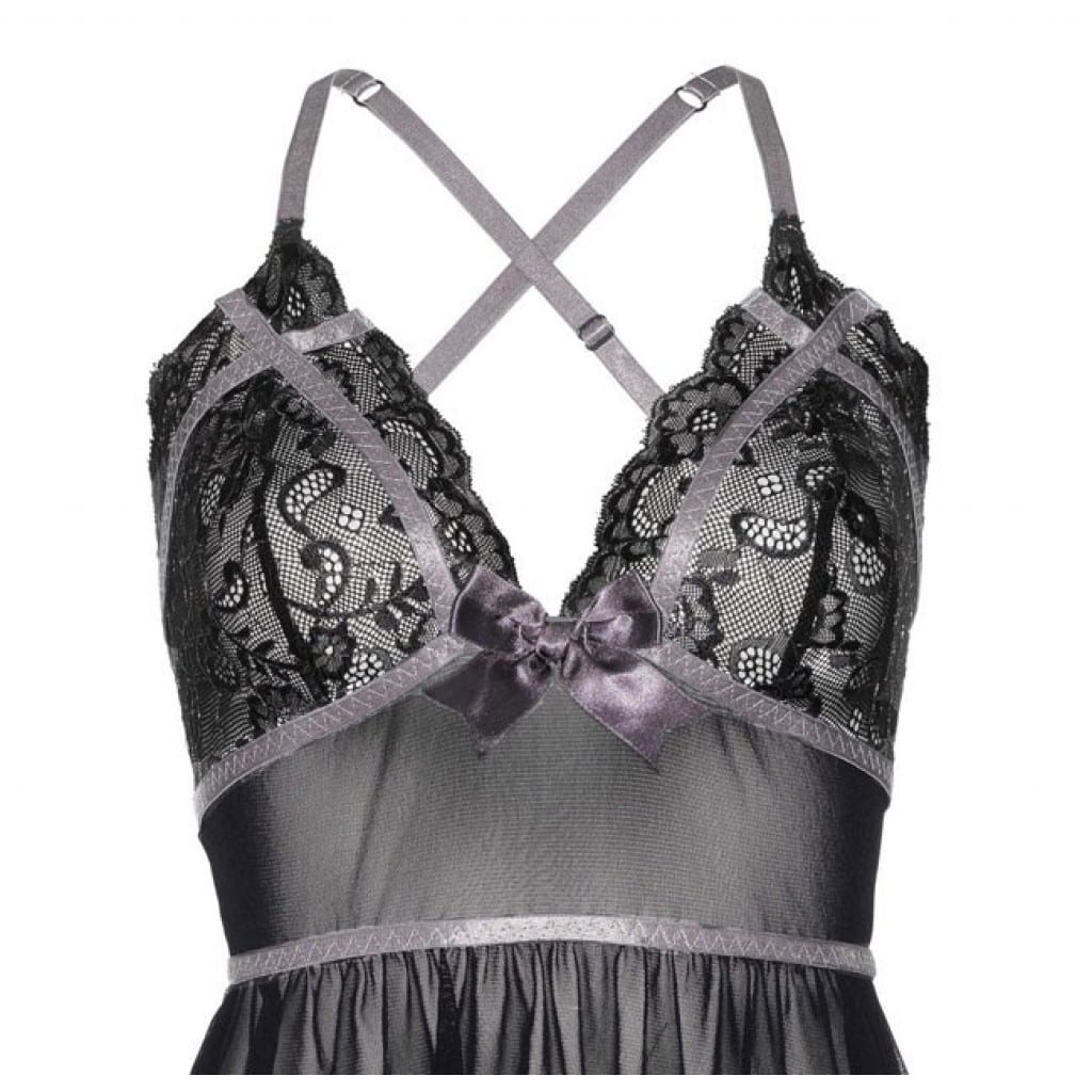 Adorable mesh babydoll with metalic lace cups from Leg Avenue. The babydoll is decorated with satin details.