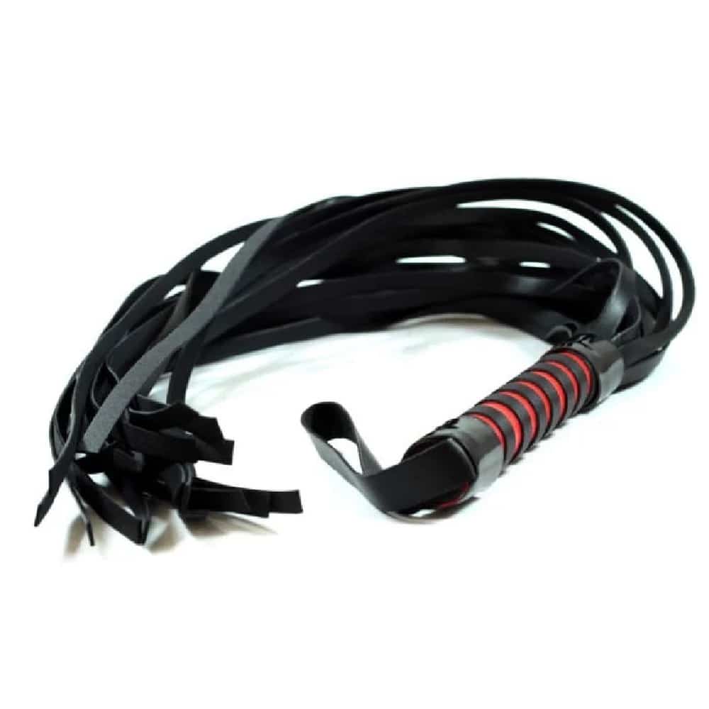 Magnificent Begginers soft leather Bondage flogger whip with red black stripes handle and 15 black tails by Naughty Toys. This entry level BDSM Flogger will defenetly amplify your Fetish intimate moments.