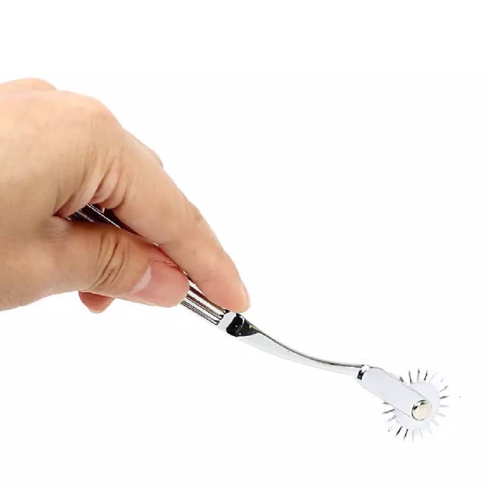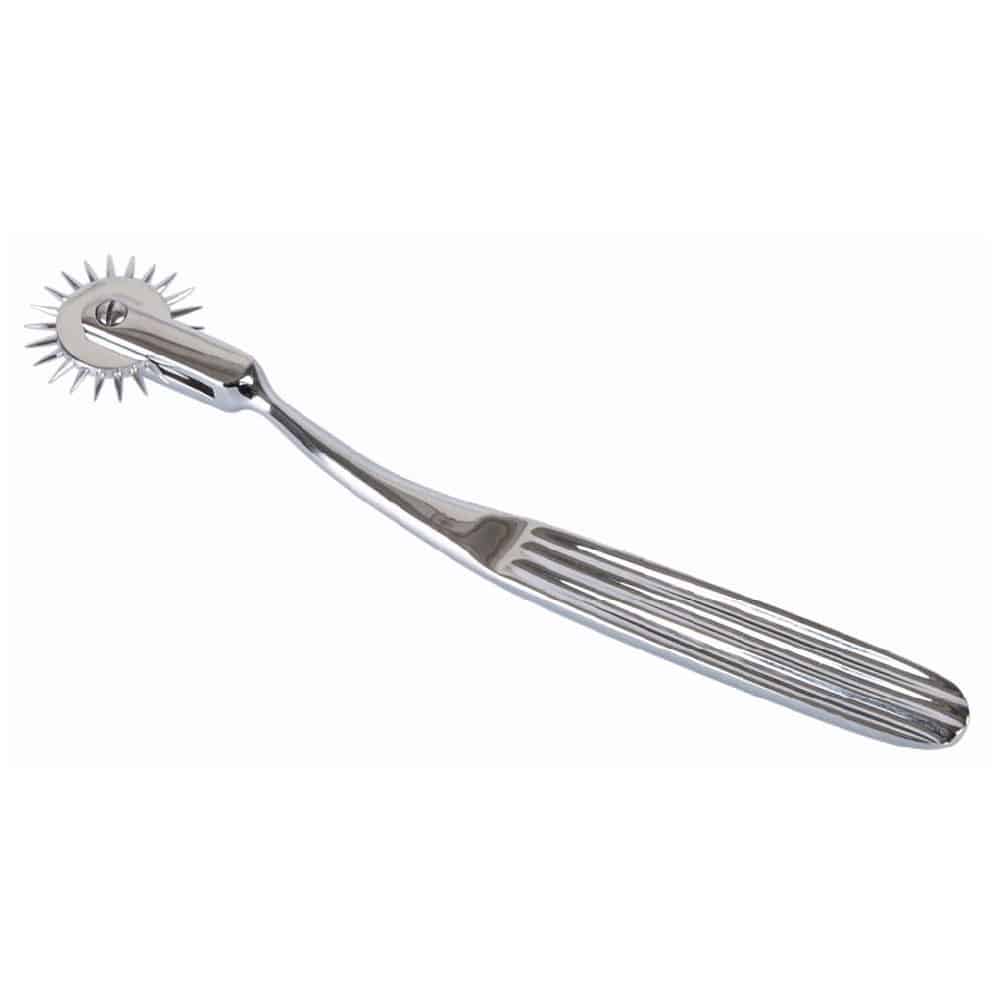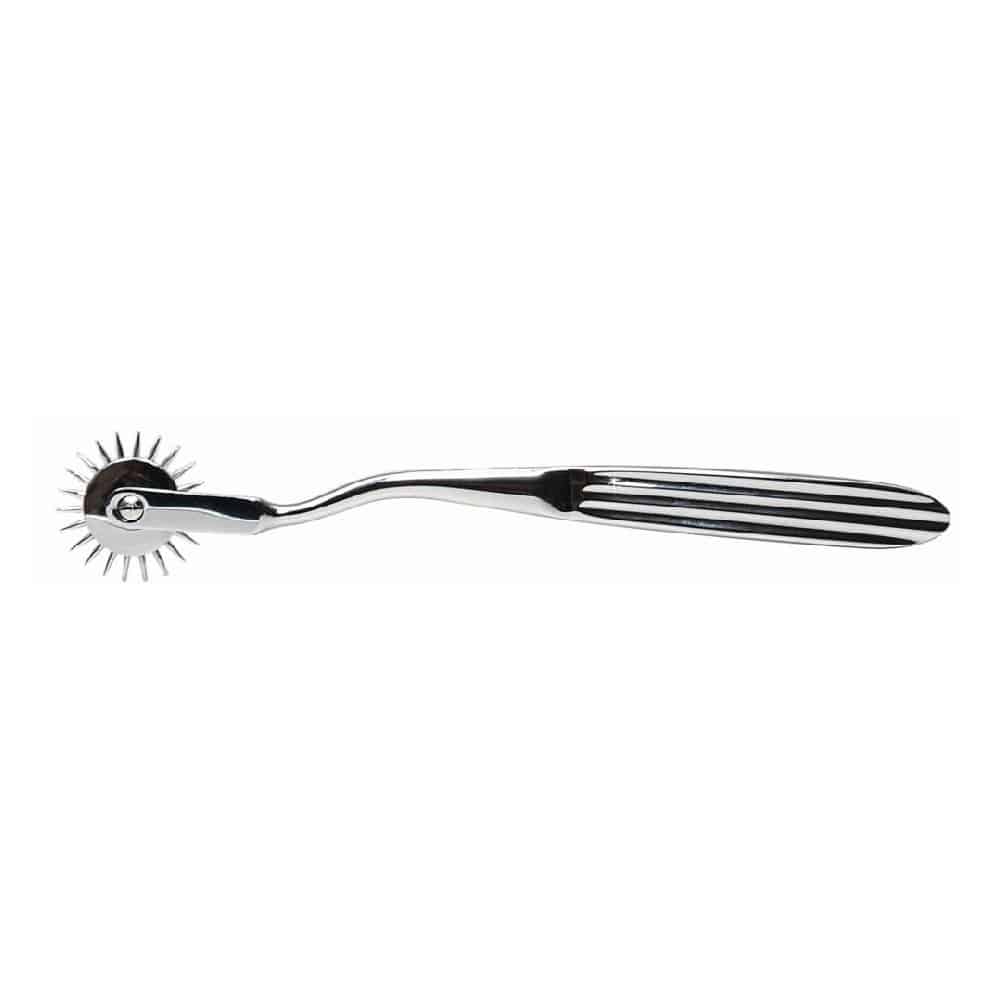 Fetish Bdsm play accessory, silver-coloured metal nerve Wartenberg wheel with spikes and a handle. Light and unbreakable. Sterilisable in an autoclave at 134° C. Inside a case without euro slot. Ca. 18 cm long with very effective spikes with a length of ca. 5 cm.