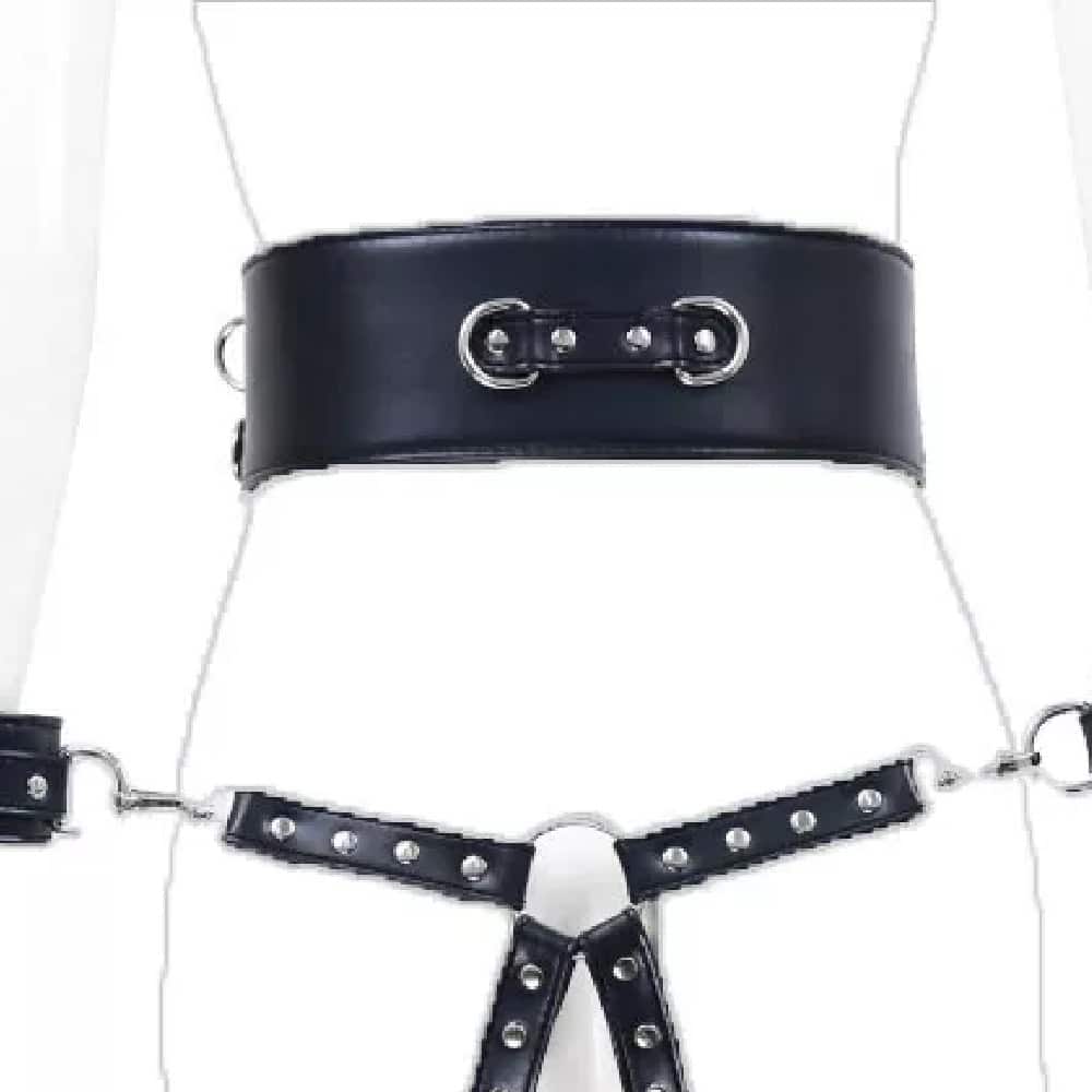 High quality imitation leather adjustable waist binding belt with silver details. Combine with your favourite collar, hand cuffs or hogtie.