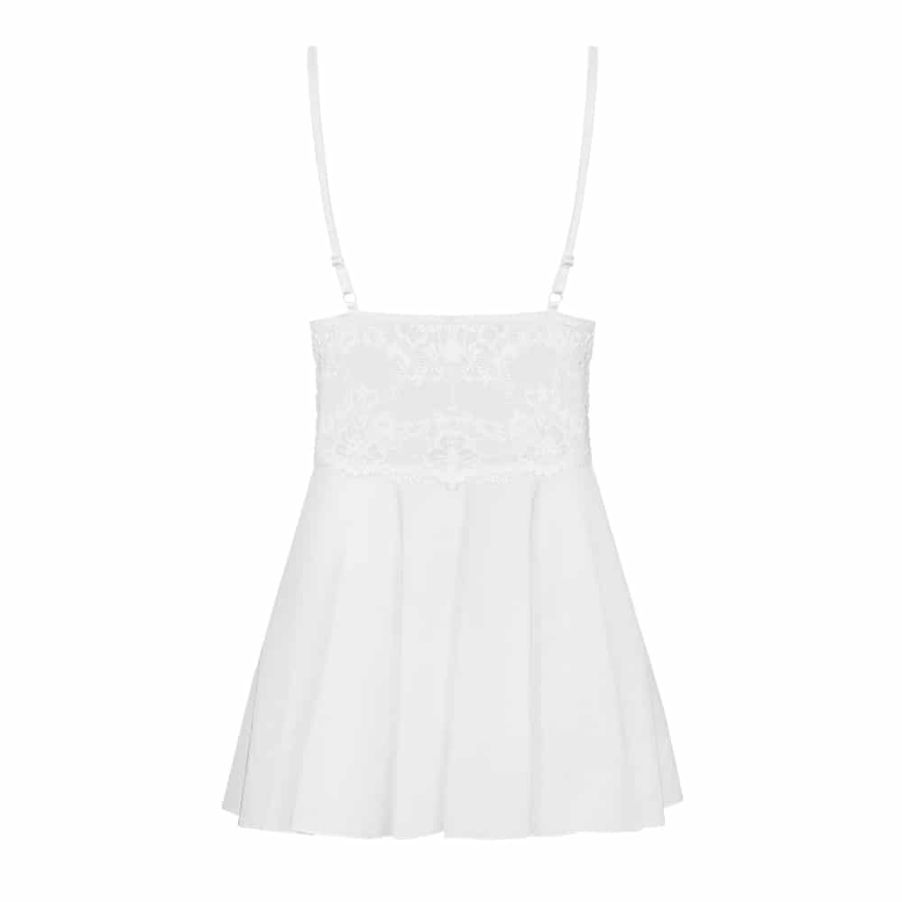 Innocent white babydoll with charming details for exciting nights or good night sleep. Incredibly lovely babydoll with matching thong from Obsessive Lingerie line. Comfortable, smooth chemise with floral lace upper part and soft, padded cups that beautifully emphasize your breasts. Set includes a mathing white string too to make your evening wear complete.