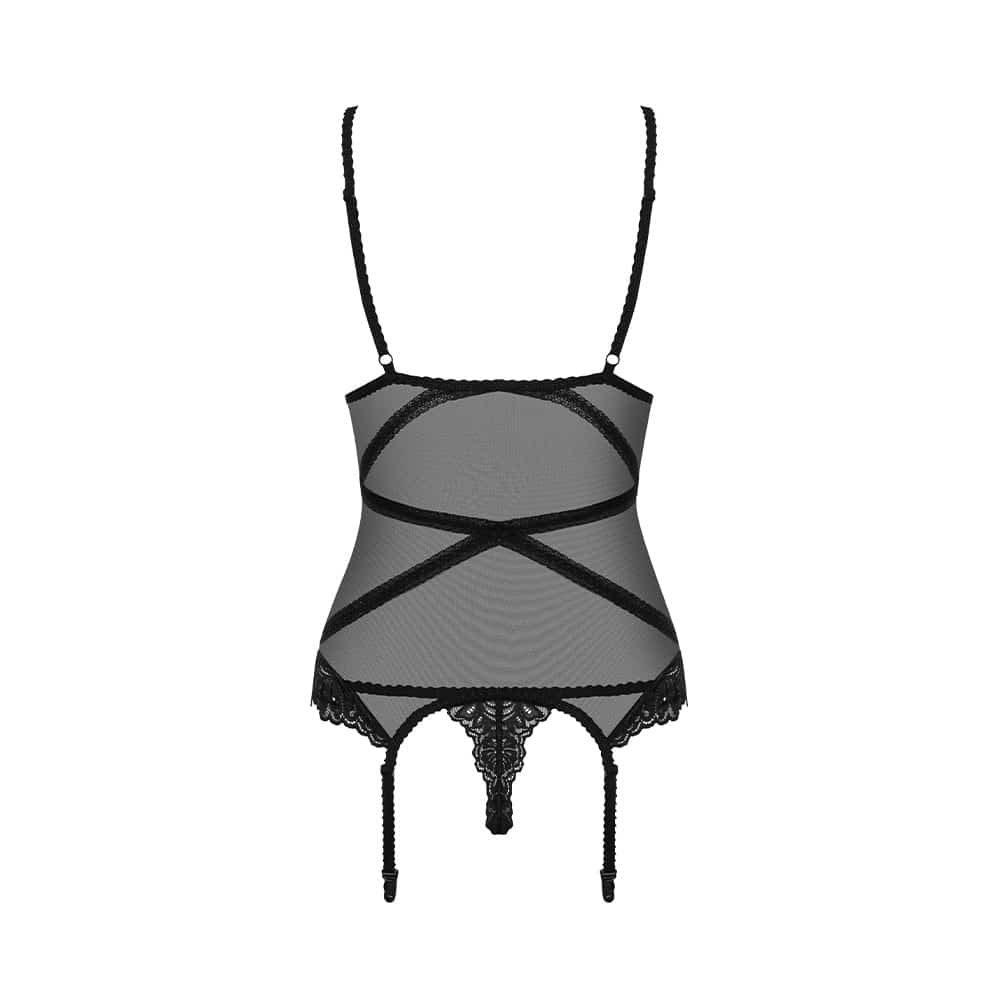Elegant black basque set from Obsessive lingerie line. The must have evening wear for every women. This set includes a translucent mesh corset with charming lace cups and matching string. Perfect combination of mesh, floral lace and straps – worth the sin!
