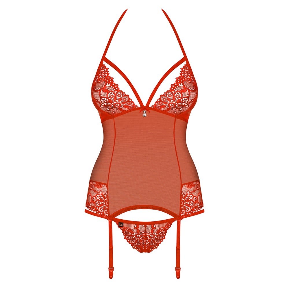 Treat yourself and your partner to this tempting red basque with unique seductive lace inserts on the bust and edges with an adjustable bra with suspender straps. A matching string is included so you can fulfill your wildest, most erotic fantasies.