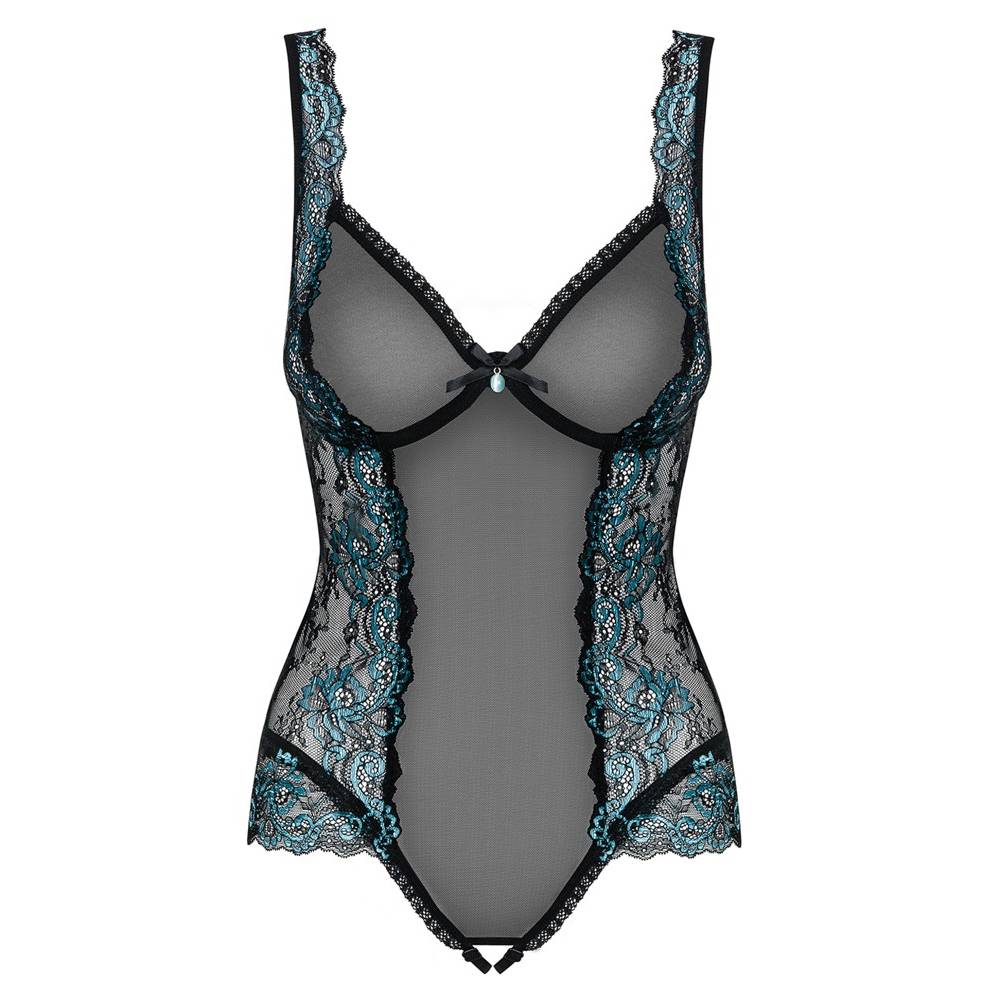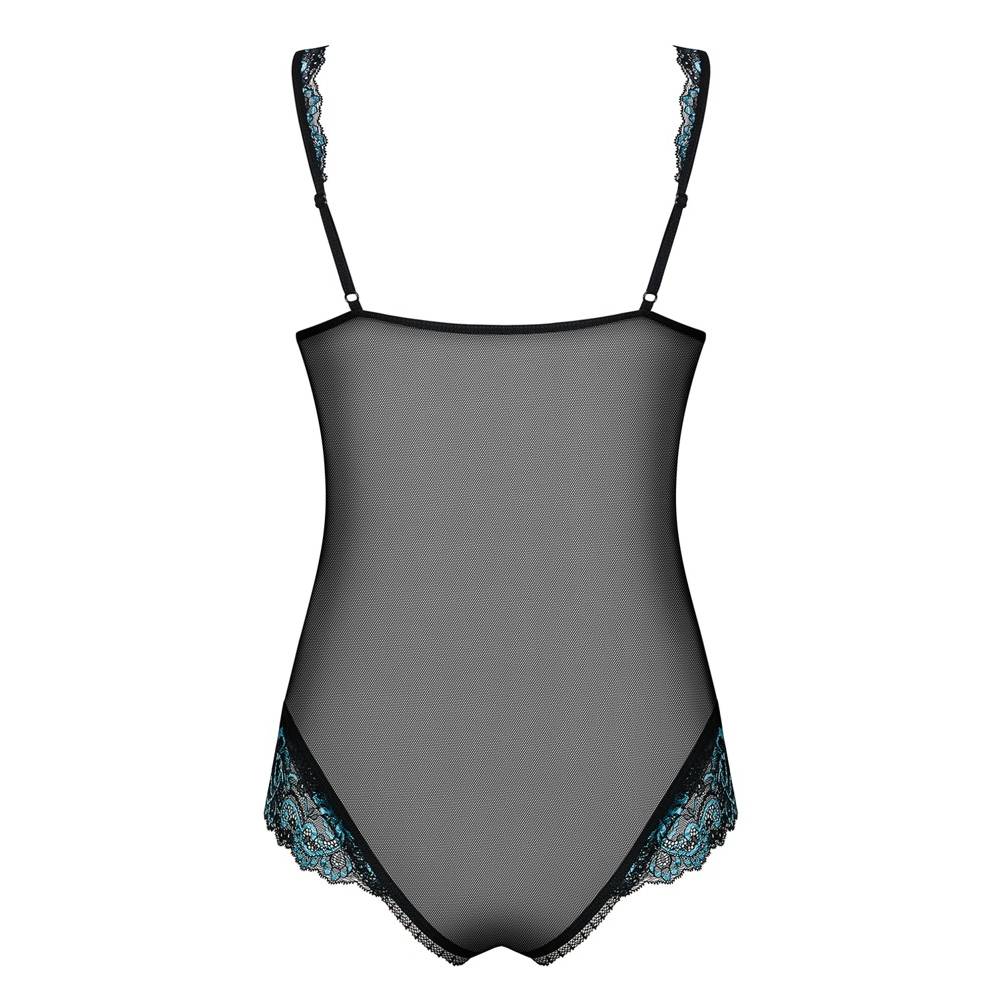 Delicate transparent mesh teddy lingerie with open crotch area. The 2 colored floral lace inserts make the teddy even more erotic. Thanks to the open crotch area you can wear it even during sex.