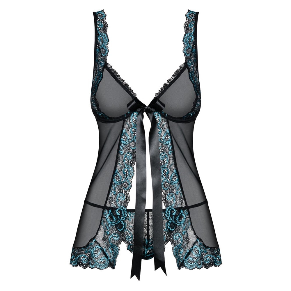 Delicate translucent babydoll with beautiful lace hem and satin bow decoration at the cleavage area. The babydoll seductively open front. Set includes a matching string.