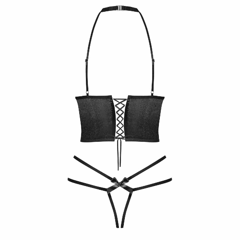 Exciting lingerie for exciting night with your beloved man! Slp into this lingerie with uniquie design and seduce your man in a second. Sheer fabric and a playful choker will encourage you to get to action. Top with padded half cups will give the perfect shape. Set includes a matching strappy thong.