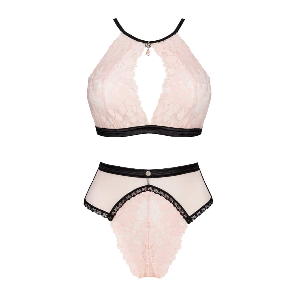 Light pink Lilines set made of delicate lace. The black trim will perfectly emphasize your silhouette. The soft bra with a teardrop-shaped neckline will emphasize the bust, and adjustable straps will enable a perfect fit to the body. High-waisted panties outline the waistline and ensure a beautiful appearance of the hips. Jewellery pendants above the breasts and on the tummy will add chic and elegance.