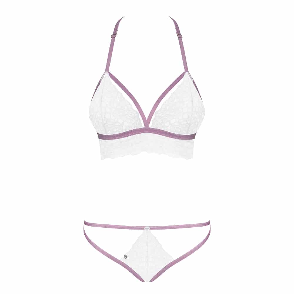 Obsessive Lilyanne Adorable Bra set ignites the senses! Sensual cut, sexy straps and elegant lace, all in white combined with subtle light lilac. This translucent set will blow your mind! The beautiful shape of the breasts and a perfect fit will be guaranteed by an adjustable strap worn around the neck. The stretchable material and elastic straps will ensure great comfort.