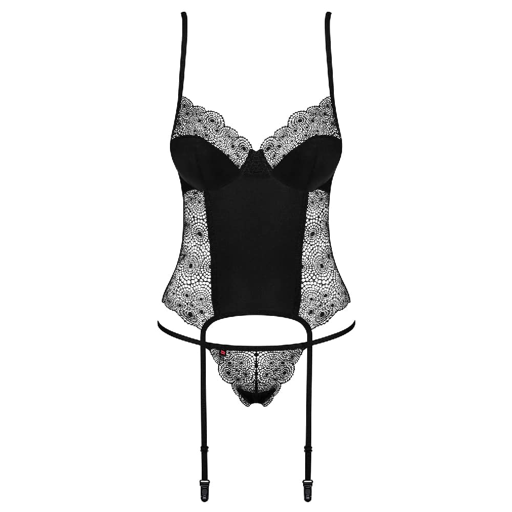 Sharlotte is an extremely feminine, eye-catching corset. Created especially for you! Thanks to the combination of classic black elegance with a very original lace pattern, you can’t pass by it indifferently. And we have added a lovely matching thong to the set. Lace on the bust, belly side, and back as well as the characteristic lacing on the back – these details will make you feel even more special. Ready for Obsessive moments for two?