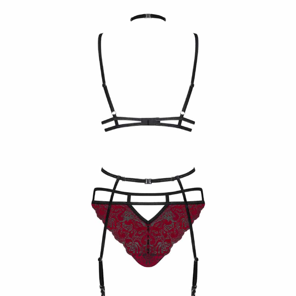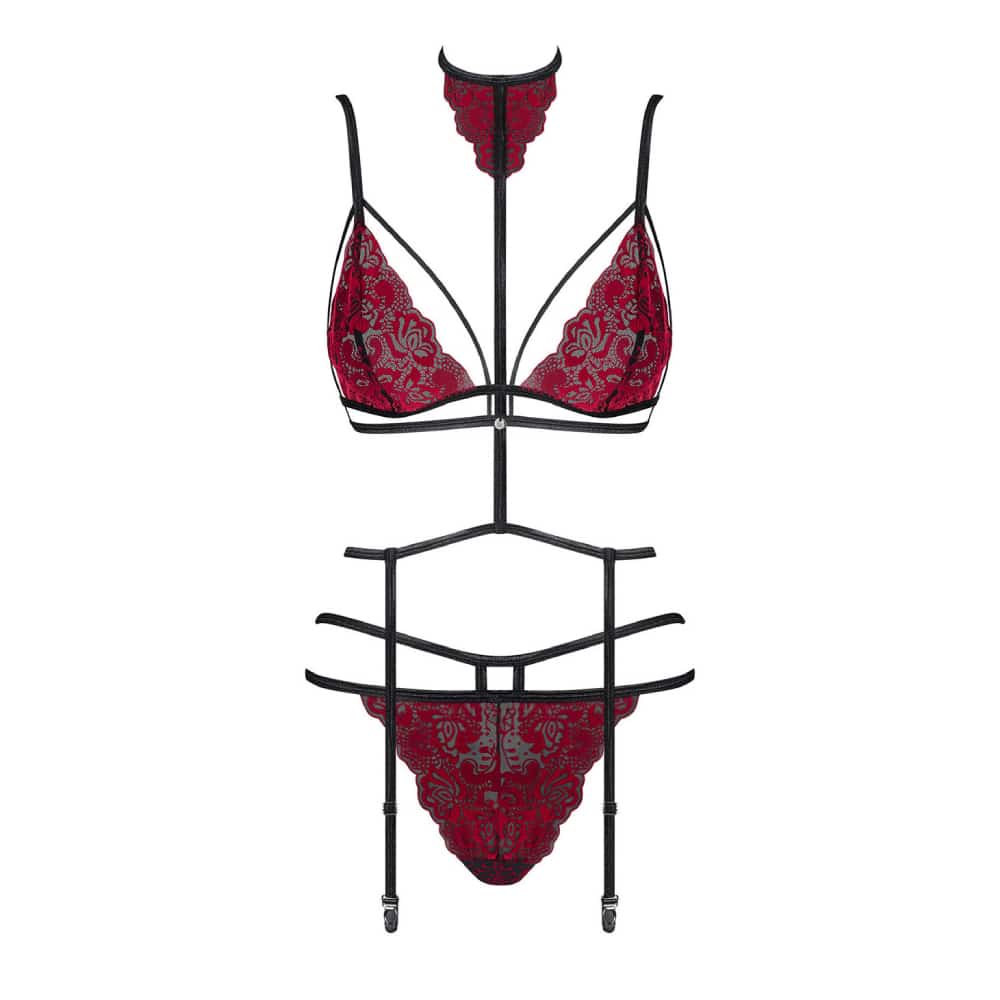 • beautiful bra, garter belt with a choker, and panties with a unique design