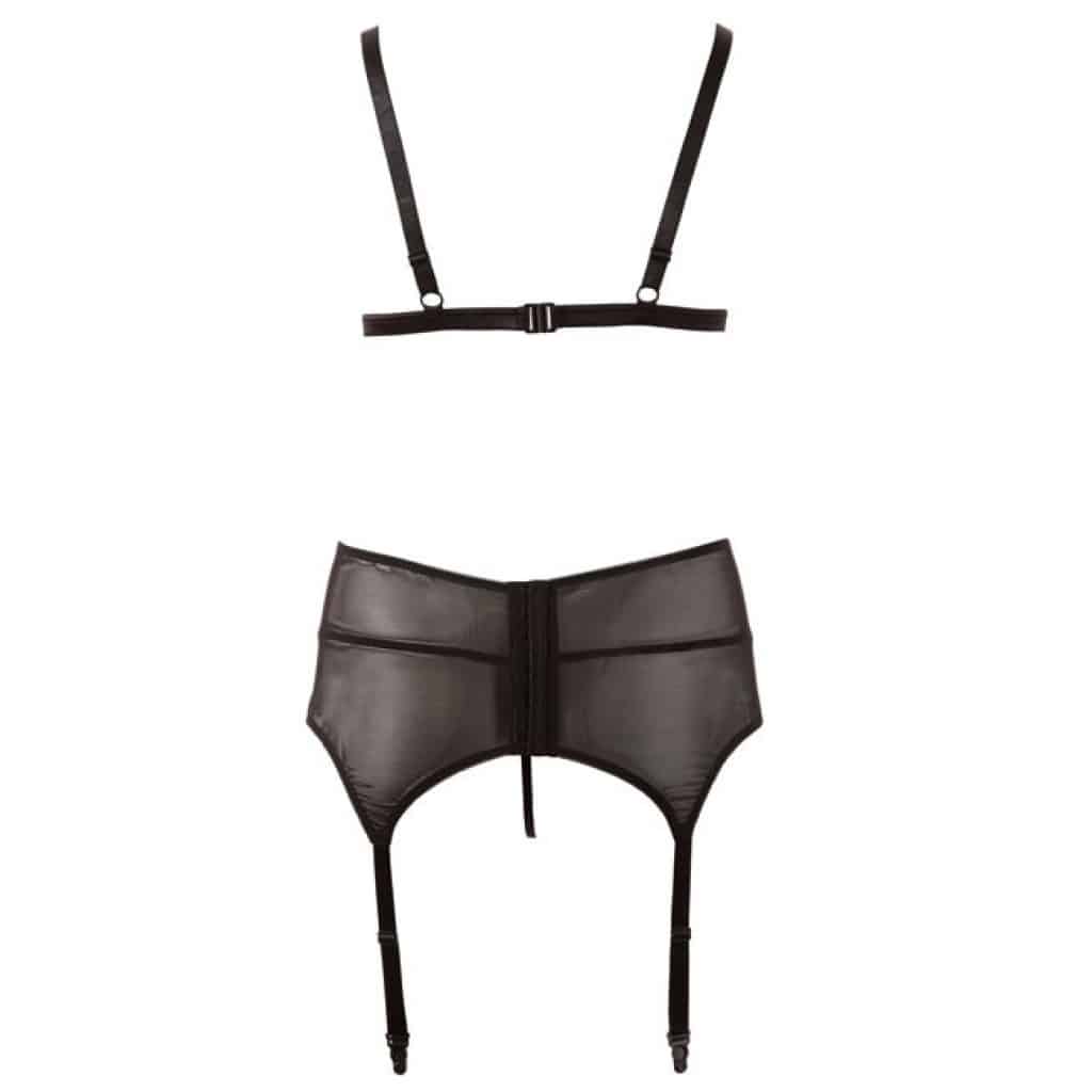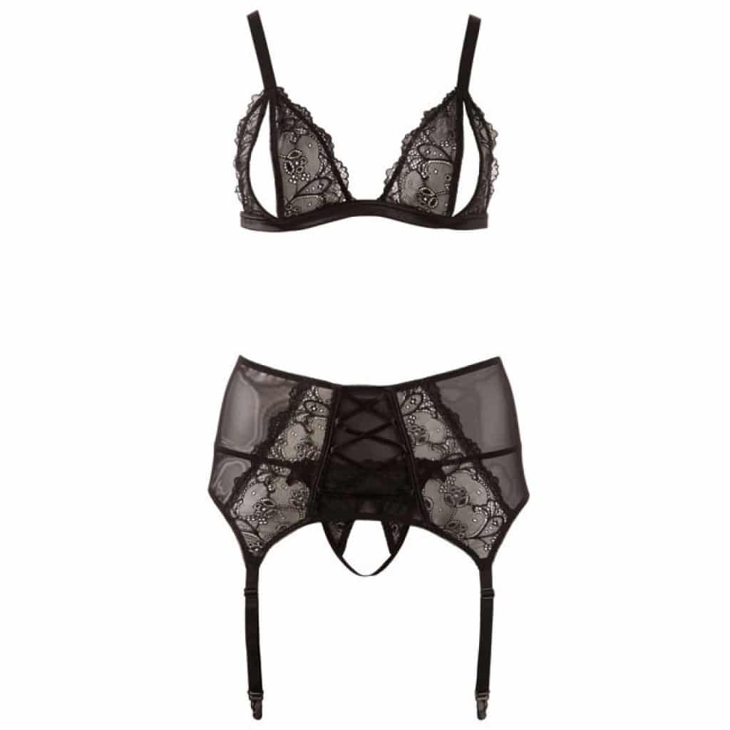 Plus Size Flowery Lace Lingerie Set by Cottelli. Plus size flowery lace bra and suspender belt set. Soft bra with open cups, adjustable straps and hook closure in the back. Suspender belt with decorative lacing and four adjustable straps. Matching string enclosed.