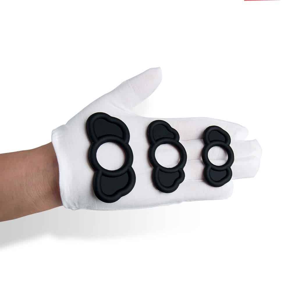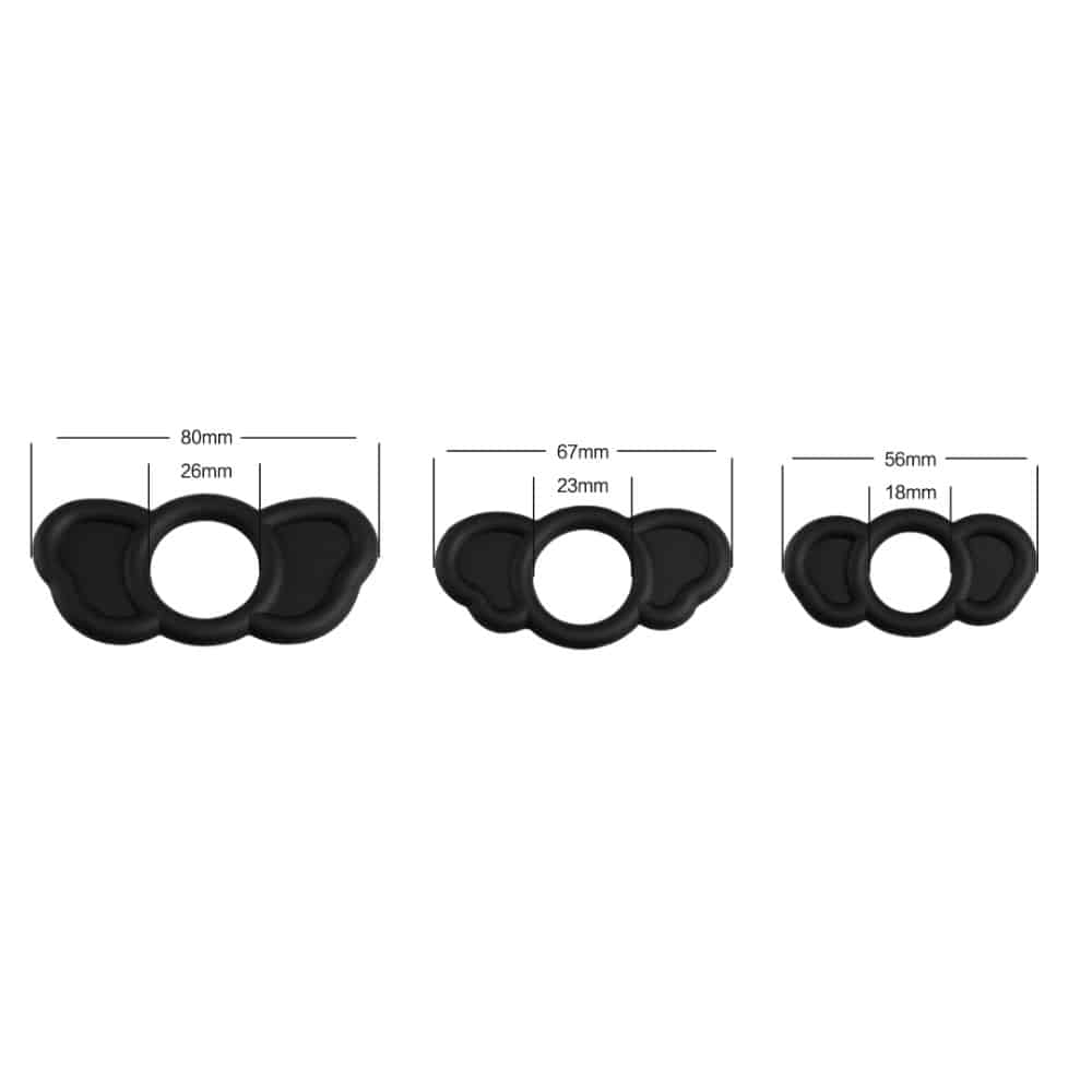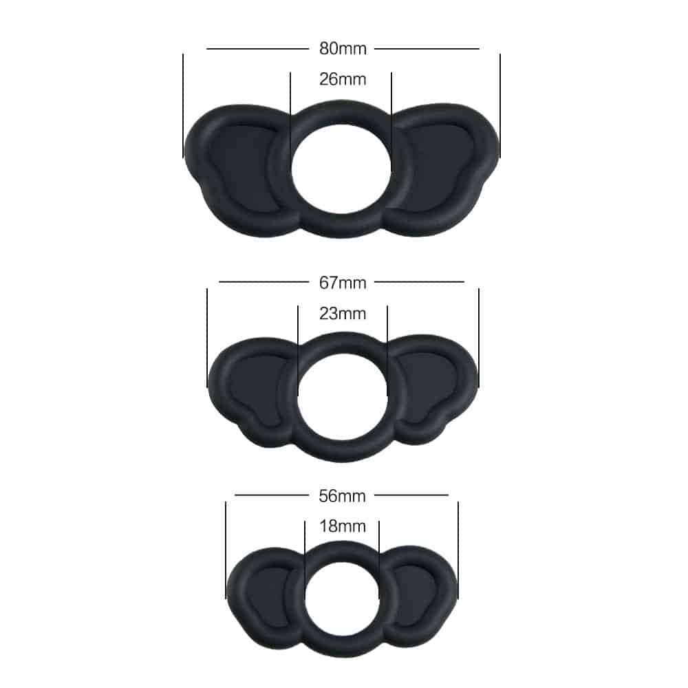 Penis rings with "elephant ears" for maximum grip and handling during fitting. Set of three Cock rings in different sizes – cover from small to large penis dimentions. Made of 100% Premium Stretchy top-graded Silicone material, stretchy, soft, flexible, easy to hold and comfortable to use. Easy to use because of the " side ears " which makes the fit-on process easy. Grab the ring from the 'ears" and stretch it to the desired size in order to pass your penis through it confortably.