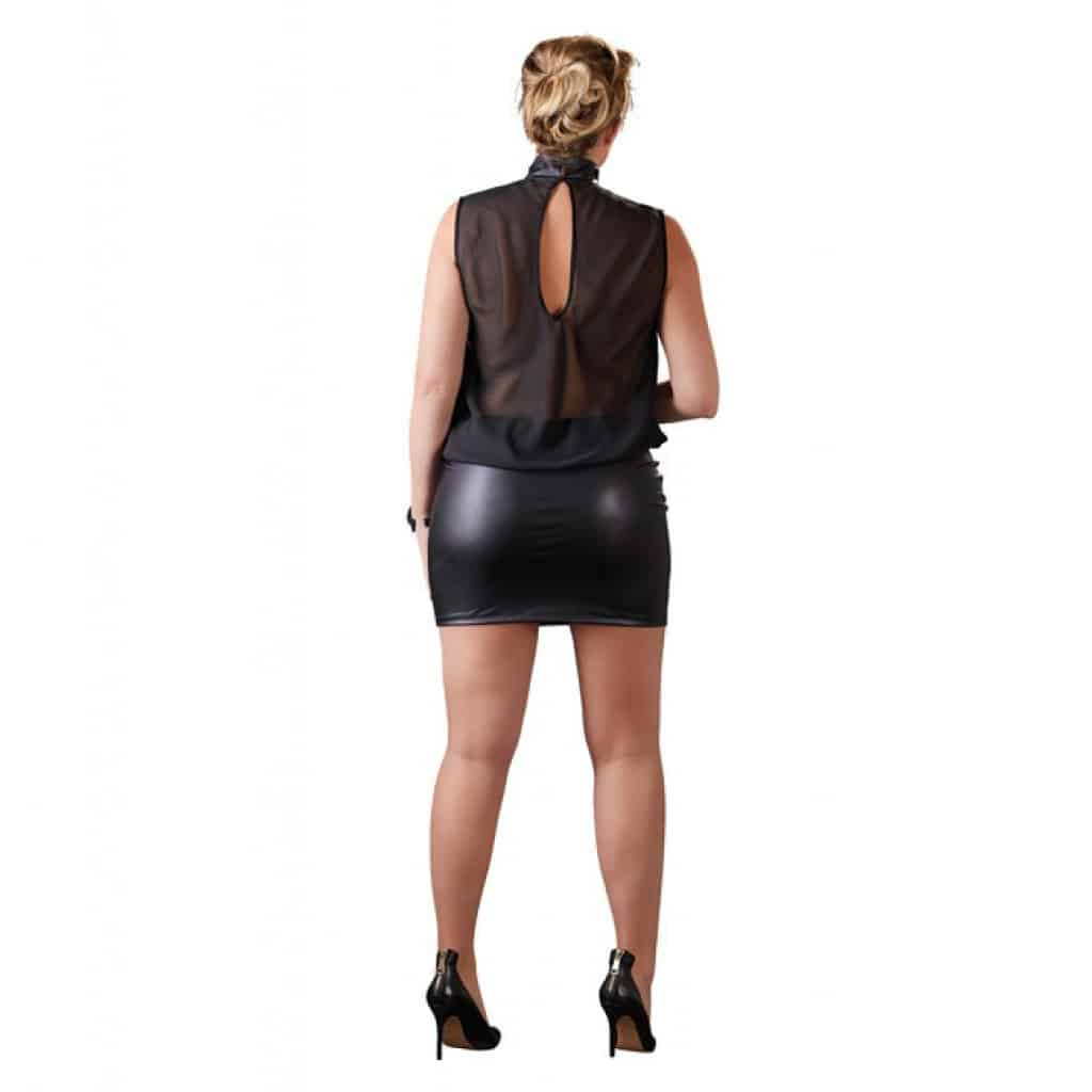 Sleeveless plus size mini dress with loose fitting translucent top part and skin tight shiny wetlook skirt.