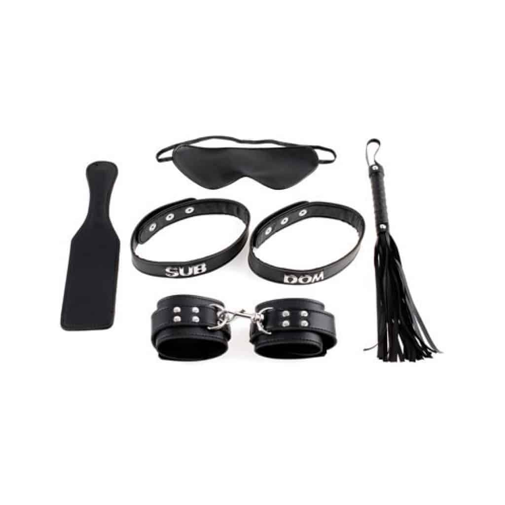 This all-in-one kink kit includes everything you need to enjoy couples-friendly BDSM play in the privacy of your own home: A pair of adjustable Leather Sub and Dom Collars, adjustable Leather Love Cuffs, a Leather Paddle, a Leather Cat O Nine Tails Flogger, and a premium Leather Love Mask to round out the collection.